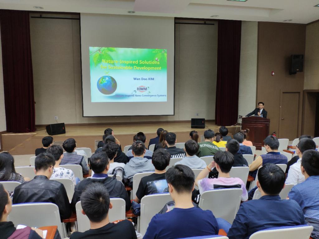10月25日出访团队访问韩国机械研究院,参观学习其先进科研装备和技术,并试乘该单位大型项目--磁悬浮列车样车。当日下午,韩国机械工程学会会长Kim Wan Doo教授做仿生领域专题学术报告,报告会上出访团队师生与Kim Wan Doo教授进行热切交流。