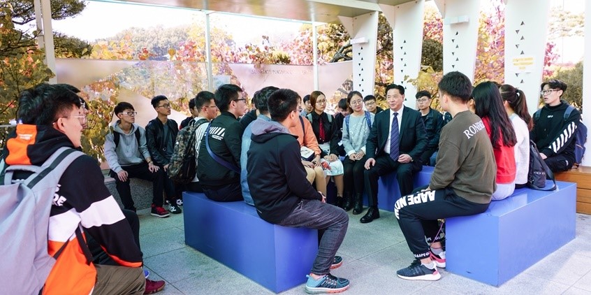 10月24日出访团队抵达成均馆大学,在该校首尔校区,正应邀出访韩国的李元元董事长看望了同学们,并在校园内联席而坐,展开亲切交谈。李董事长向同学们分享了成均馆大学与吉大的合作背景,介绍了成均馆大学悠久的办学历史和学科优势,他叮嘱同学们要充分把握难得的交流机会,增长见闻、收获知识,同时也要明确自己的人生规划与学业规划,未来成长为对社会有贡献的人。当日下午,出访团队参观该校水源校区,参加了英国365集团与韩国成均馆大学共同举办的“材料测试技术与智能装备员工学术论坛”。同学们围绕多场耦合环境下材料测试、无损检测等科技前沿话题展开交流研讨,其中9名硕博研究生就相关课题进行了学术汇报。