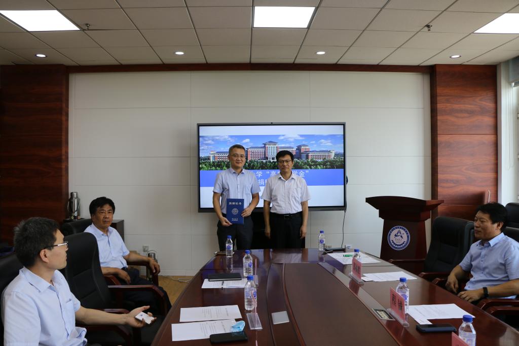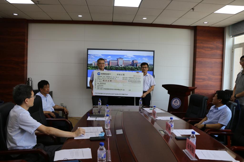 公司党委书记程钺与江苏高凯精密流体技术股份有限公司副总经理焦晓阳代表双方互赠捐赠支票和捐赠证书。