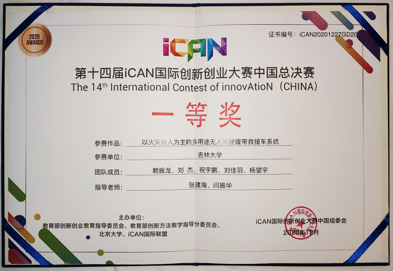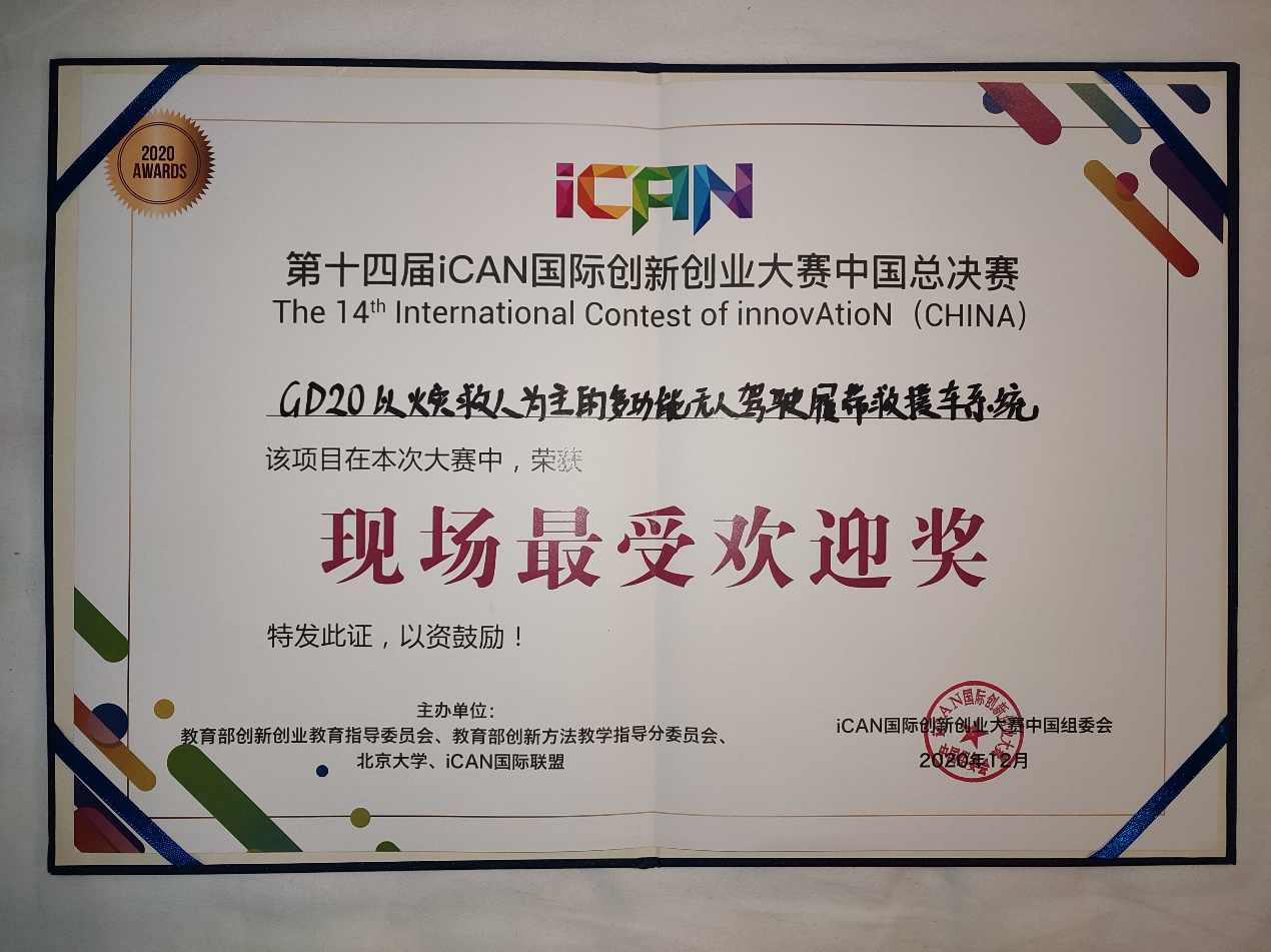 2020年12月26日,第十四届iCAN国际创新创业大赛中国总决赛在浙江余姚市举行,公司赖振龙等同学研制的“以火灾救人为主的多用途无人驾驶履带救援车系统”作品在820支决赛队伍中脱颖而出,斩获国家级一等奖,同时获得现场最受欢迎奖(仅五项)。