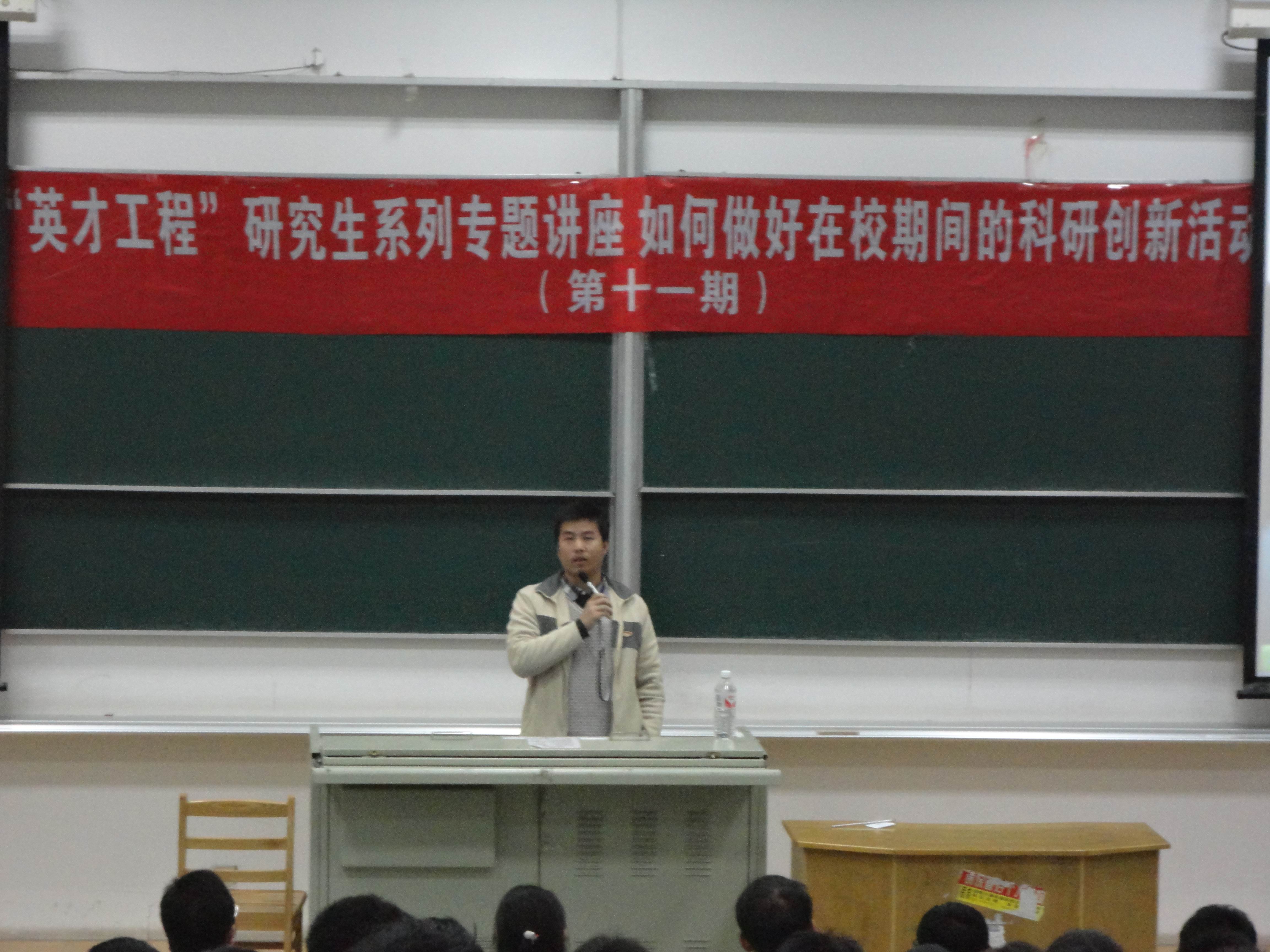 此次讲座邀请了“希望团队”中的数位精英向大家讲解如何做好在校期间的科研创新工作。首先,王中强同学结合自己在清华大学“博士生实践服务团”的工作经历与大家做了分享,他把在该团的活动做了细致的介绍,并分享了近期开展的一次“红色之行”的活动。对于活动之后的体会,他着重提出了实践与调研的重要性,提出在科研创新中尤其要坚持实践与理论的结合。接着上台的是黄虎同学,作为一名在读研究生,黄虎已取得一系列令人瞩目的成就:发表论文10余篇: Review of Scientific Instruments发表论文1篇,在Journal of Manufacturing Systems发表论文1篇, 另外发表EI收录论文5篇等等;与他人合著英文专著1部;申请和授权专利18项。结合自己的实际经验黄虎提出了搞科研做创新要坚持不懈,经得起诱惑,耐的住寂寞。