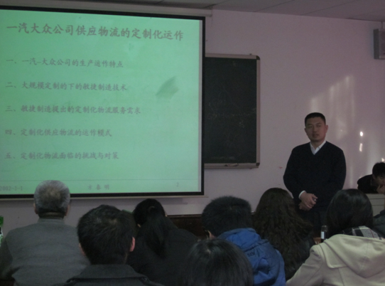 2011年11月20日上午8:30分,长春一汽大众集团有限公司管理培训主管方春明博士受工业工程系主任孔繁森教授的邀请,在南岭校区机械材料馆529室为机械公司师生做了一场题为《一汽大众公司供应物流的定制化运作》的专题讲座。