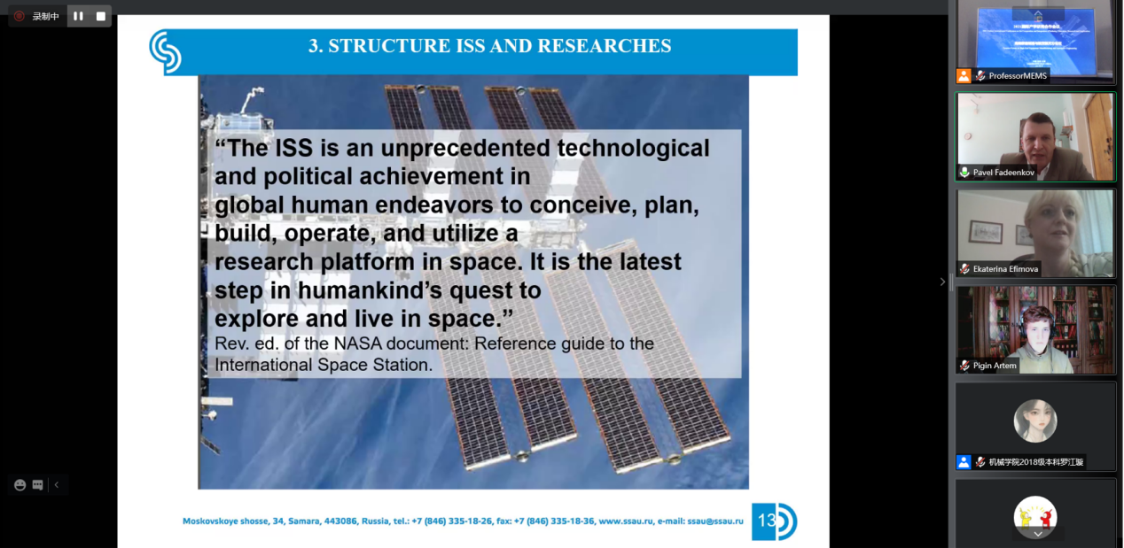 分论坛邀请了来自俄罗斯莫斯科物理技术公司、俄罗斯萨马拉国立航空航天大学、乌兹别克斯坦塔什干国立技术大学、上海大学和英国365集团的专家作会议报告。报告围绕高端装备制造,涵盖飞机发动机制造技术、飞行器结构设计、国际空间站技术、宇航员人因工程、无人机制造等内容。专家们分享了最新研究成果,就所在领域的发展方向、核心技术研发以及工艺实现等方面进行了深入交流探讨,并与与会师生进行了线上互动。
