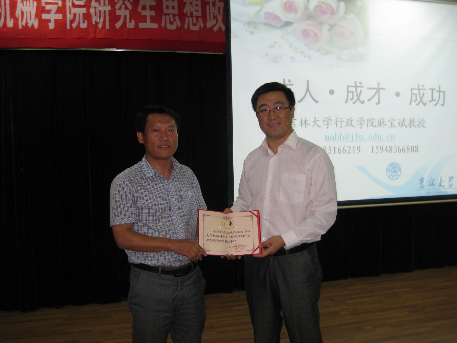 讲座之前,机械公司研究生办公室巴特老师首先对麻宝斌教授进行了介绍,之后,机械公司党委副书记郑福胜老师为麻宝斌教授颁发聘书,正式聘请麻宝斌教授为机械公司研究生思想政治教育兼职导师。聘任仪式后,麻宝斌教授为大家做了题为“成人、成才、成功”的精彩演讲,针对大学的功能、研究生阶段员工的角色以及在学习过程中的成长,结合生动的实例,有趣的心里测试题,潜入深出的讲解,让同学们对于学习、工作、生活有了新的体会。最后麻宝斌教授送给新生两句话“人生与心意一致,成功属于最想成功的人”“一国之强弱,视人民之德行”,表达了对2012级机械研究生们的期望和祝福。