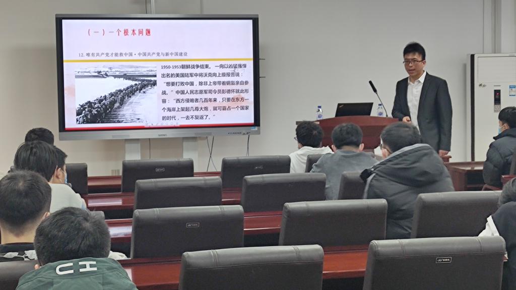 在此次宣讲中,史旭超博士首先概括了党的十九届六中全会的主要内容:全会听取和讨论了习近平受中央政治局委托向全会作的工作报告;审议通过了《中共中央关于党的百年奋斗重大成就和历史经验的决议》;审议通过了《关于召开党的第二十次全国代表大会的决议》。在讲解六中全会主要内容过程中,史旭超博士重点围绕“中国共产党是什么、要干什么?”这个“根本问题”展开论述,告诫同学们要以史为镜,奋发有为,为中华民族伟大复兴事业做出贡献。他呼吁同学们认真学习贯彻六中全会精神,深刻领悟全会召开的重大意义,准确把握全会的精神实质,深入认识《决议》的深远影响。最后,史旭超博士殷切叮嘱同学们:“勿忘昨天的苦难辉煌,无愧今天的使命担当,不负明天的伟大梦想!”