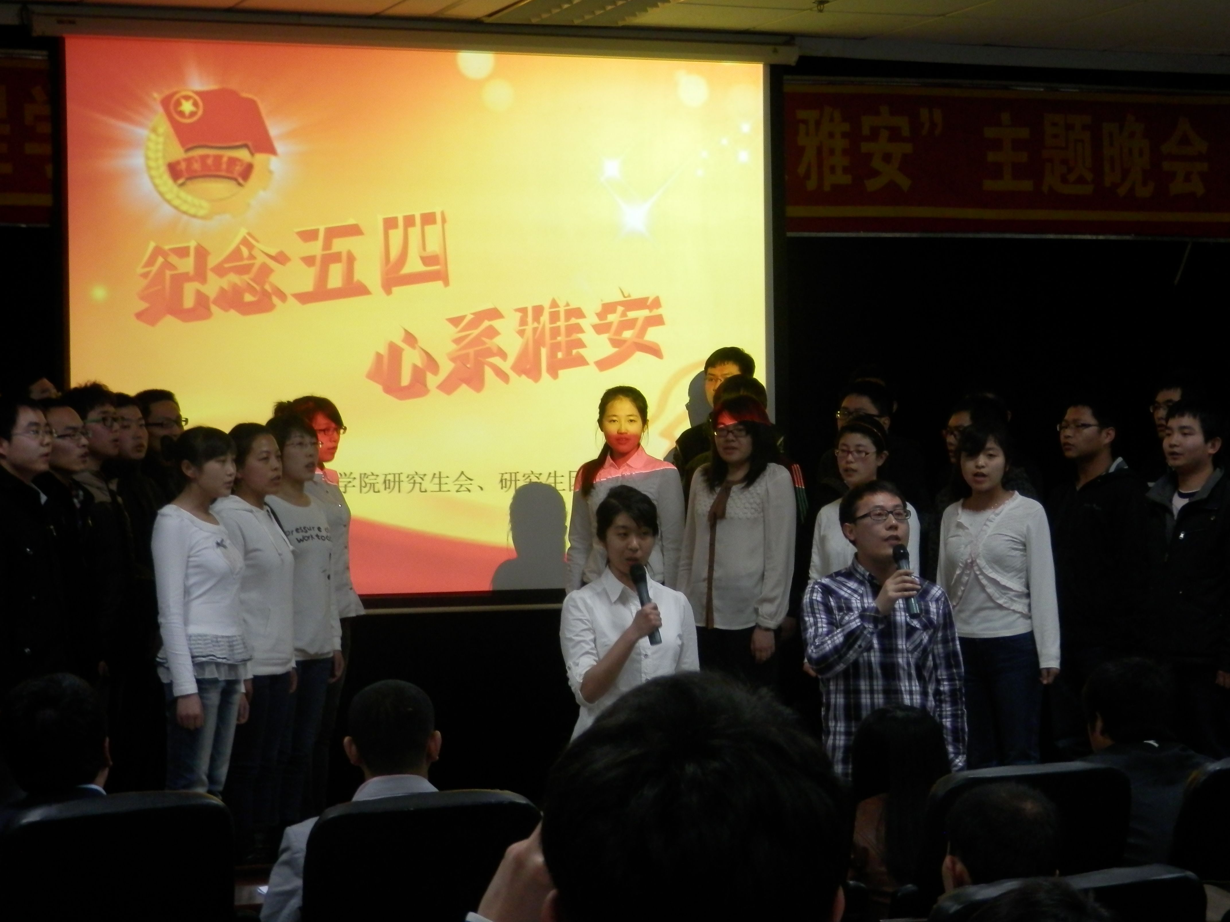 研究生同学们分别以诗词朗诵、合唱、独唱以及“五四运动”知识问答以及募捐等不同的表达方式,传诵五四革命精神、悼念雅安地震同胞,同学们积极参加,表现踊跃,最后经过评委及老师评议,机械工程班级勇夺个人及集体双料冠军。晚会表演结束后,举行了颁奖仪式,巴特老师为参加演出的同学们颁发了奖品并合影留念,与会全体师生向灾区人民捐款、捐物,共募集捐款3300余元,主题活动画上圆满句号。