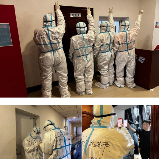 随着疫情的加剧,核酸检测频率也随之增加,医护人员明显人手不够,因此我们摇身一变,变成了大家熟悉的“大白”,几个充了气捂得严严实实的大白每天下午活跃在4公寓。“大白”确实不是那么好穿的,闷热先不说,只要一说话,防护眼镜里就起雾了。但比起外来的医护人员,我们只穿两个小时,她们却要穿一整天,实在是很辛苦。当然,检测过程也会有一些小插曲,穿着“大白”站在你认识的人面前,只要不说话,他就不会认出你来,真是难得的一段记忆。