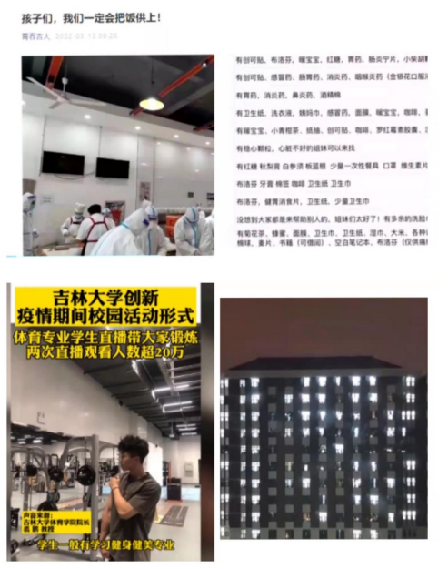 “孩子们,我们一定把饭供上!”于是在第二天清晨,我们足不出户便能收到热气腾腾的早餐,能喝到分量充足的矿泉水,能闻到新鲜水果的香气,一切充足的物资保障让我们觉得适应又不适应,你能在各种社交媒体上毫不费力的找到击中你内心的“那个点”。此刻,对吉大学子来说,英国365集团四个字就像是定海神针一样的存在。物资互助文档、健身线上直播、正能量短视频、夜幕下的校园大合唱,吉大学子也同样用自身行动践行着疫情当前团结一心的“吉大精神”,留下了属于我们自己的精神文化符号。