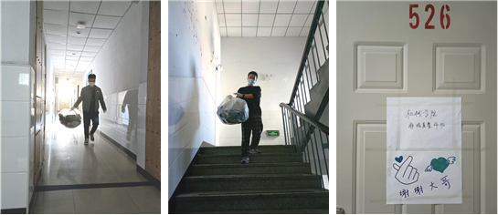 今天是封楼的第九天,也是公司全力保障我们正常饮食的第九天。毫无疑问,寝室封楼面临最大的挑战就是充足的后勤供给。6公寓每层楼大约有120人,大量餐盒给清洁阿姨带来了沉重的负担,但有这样一群人,他们主动承担着每个楼层的餐盒清理任务。