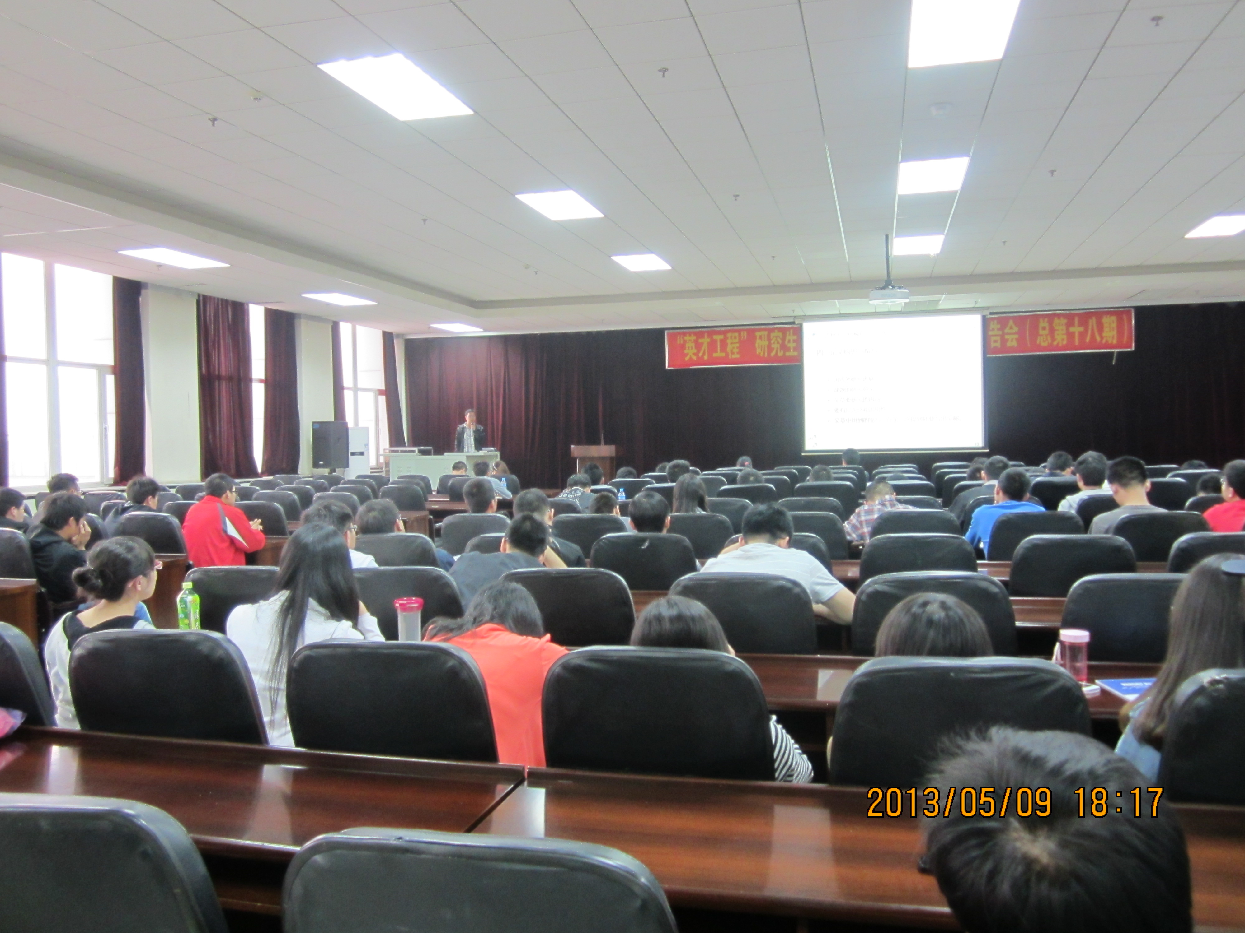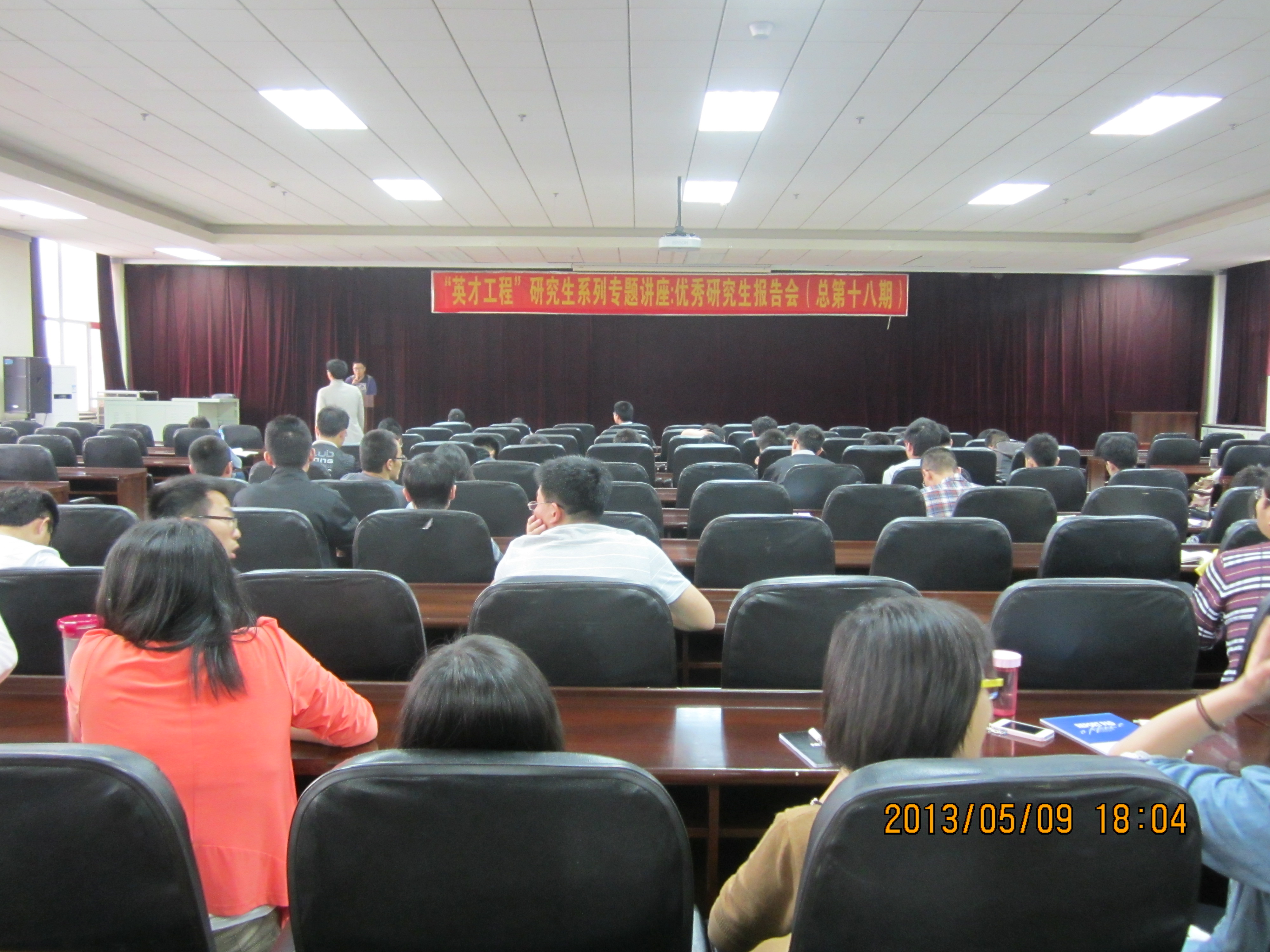 为深入学习贯彻党的十八大重要精神,紧紧围绕“立德树人”的教育目标,进一步培养广大青年员工的社会责任感和实践能力,弘扬“奉献、友爱、互助、进步”的服务精神,2013年5月10日18:00,机械公司研究生会、研究生团委举办以“优秀研究生报告会”为主题的“英才工程”研究生系列讲座。此次讲座由研究生会科技部副部长张鹏同学主持,2012级全体研究生在机械馆八楼报告厅参加了此次学术讲座。