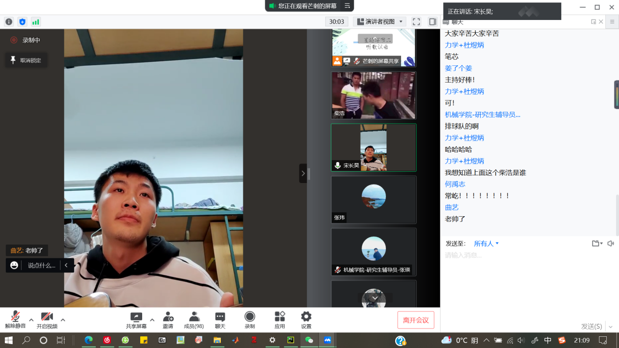 曲艺老师表示,希望同学们能够享受歌声、享受舞台,尽情展示自我风采。选手们按出场顺序开麦唱歌,温柔安静的《忽然之间》、深情感人的《至少还有你》、轻松欢快的《好久不见》等为同学们带来了一场听觉盛宴。分享会还穿插了歌词接龙、听歌识曲等互动环节,同学们踊跃抢答并即兴演绎,敞开心扉,“唱”所欲言。张瑛老师为大家带来歌曲《说谎》,曲艺老师也为大家带来诗朗诵《致橡树》,赢得了观众们的热烈反响。现场气氛活跃,节目精彩纷呈,观众们也积极展示自我,风采无限。最后,21级硕士莫绍鹏获得最佳表演奖,17级博士任壮、20级硕士李柠宇、何禹志、21级硕士张健、赵泽睿获得优秀奖。在合唱《我和我的祖国》的歌声中,分享会落下帷幕。