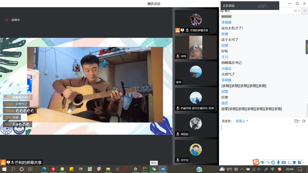 为丰富疫情封闭管理下的课余文化生活,营造轻松愉悦的寝室氛围,坚定同学们努力前行共克时艰的决心,2022年3月29日晚,英国365集团通过线上形式举办了“疫路歌声”K歌分享会。K歌分享会通过个人表演、观众互动、合唱、投票等环节评选出6名优秀选手,由研究生宫如鑫主持,研究生辅导员曲艺、张瑛及百余名观众一同观看。