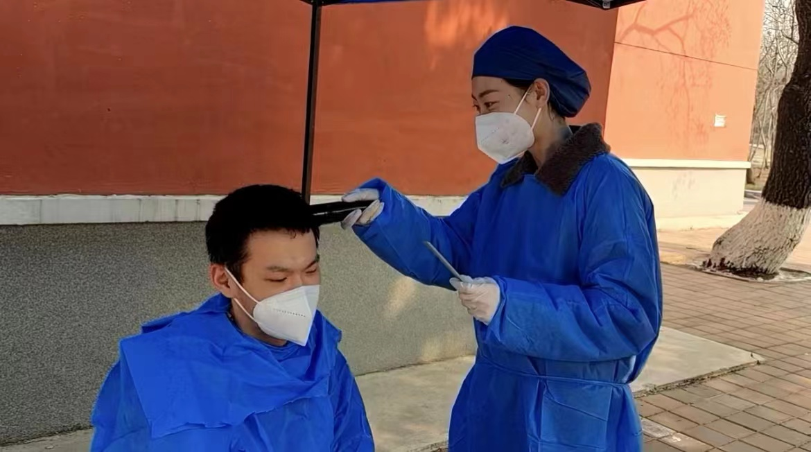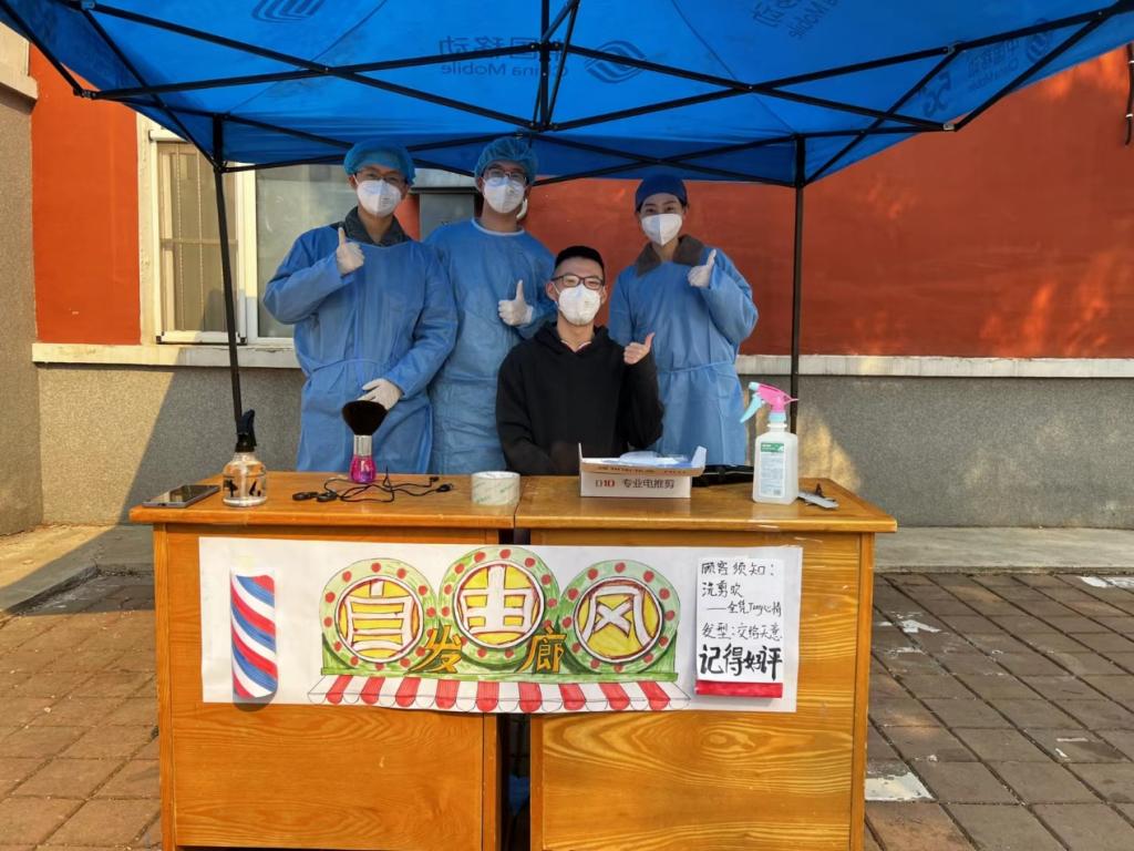“理发师”高文迪说,“作为一名研究生,科研之余能够为校园疫情防控尽一份心、出一份力,成就感和自豪感油然而生,虽累但值得!相信只要师生一心,众志成城,我们一定能“剪”去疫情的阴霾,让校园恢复往日神采”