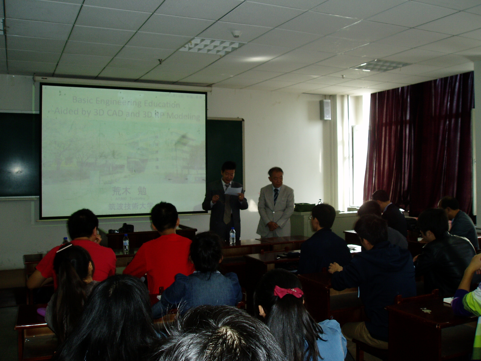 2013年9月5日上午9点,应机械科学与工程公司机械基础教学中心孟祥宝教授的邀请,日本筑波技术大学产业技术学部荒木勉教授在南岭校区机械材料馆529室为公司工程与计算机图学和机械原理与设计教研室教师及部分研究生作了题为《基于三维CAD及快速成型建模技术的基础工程教育》的学术报告。机械公司主管教学副经理周晓勤教授出席并主持了此次报告会,机械基础教学中心冯增铭副主任出席报告会并在会前陪同荒木勉先生参观了中心实验室。吉野辰萌教授特为此次报告会进行了全程翻译。