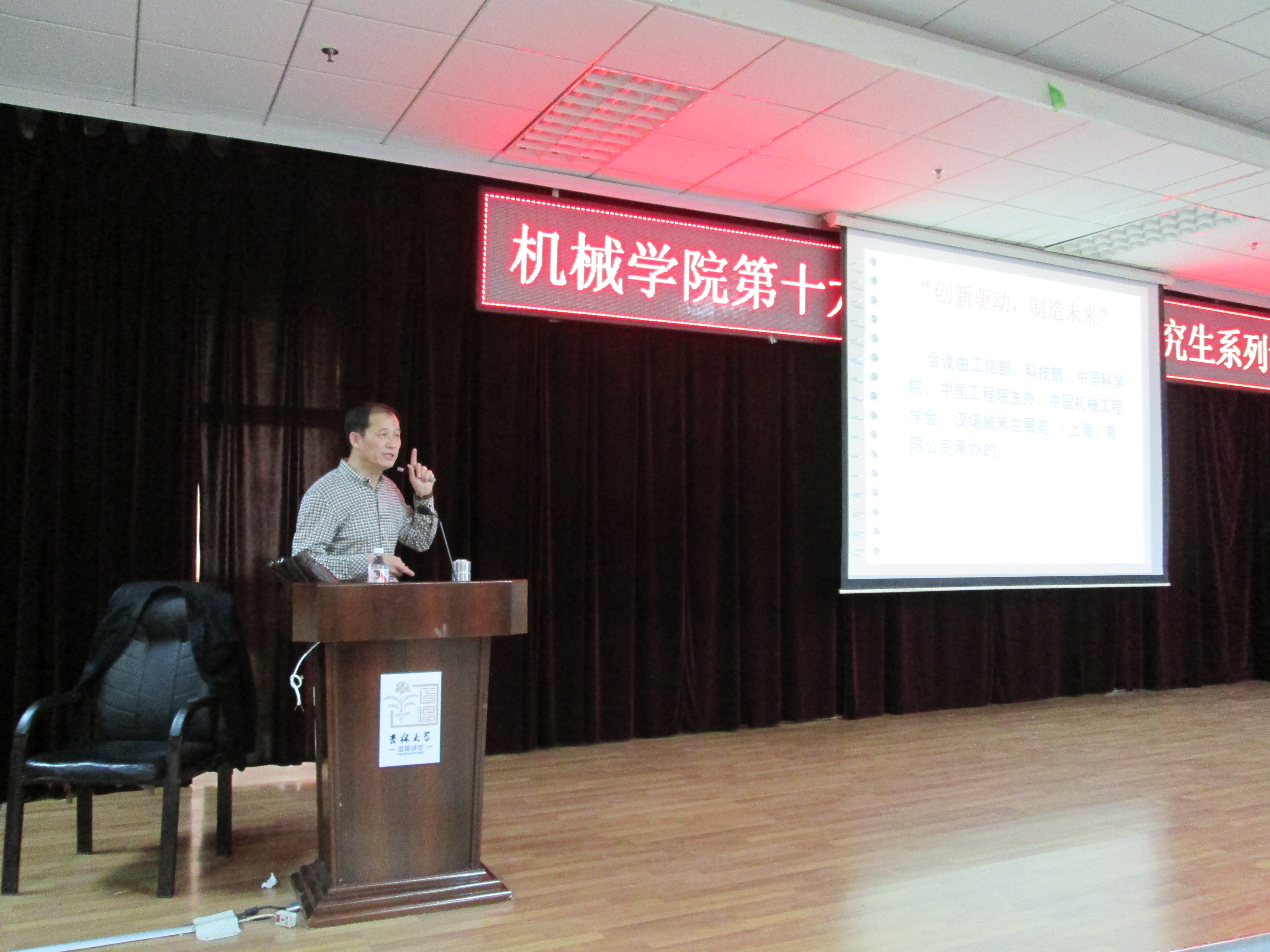 2014年5月22日18:00,在机械馆八楼会议厅举办了以“面对中国制造2025,我们该怎么做?”为主题的机械科学与工程公司“英才工程”研究生系列讲座。本次讲座邀请了机械公司机械制造及自动化系主任曲兴田老师作为主讲人,2013级全体研究生参加了此次讲座。