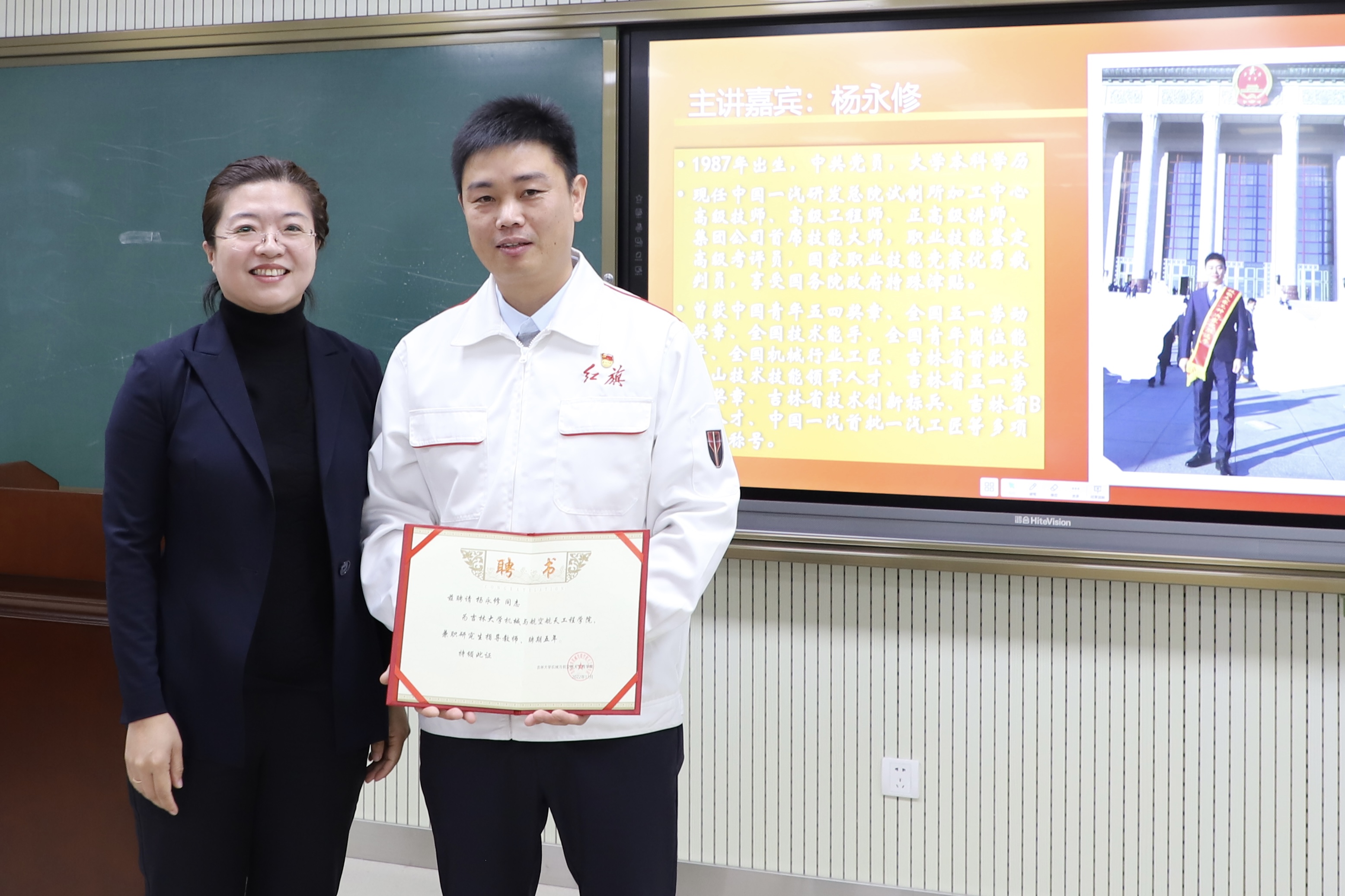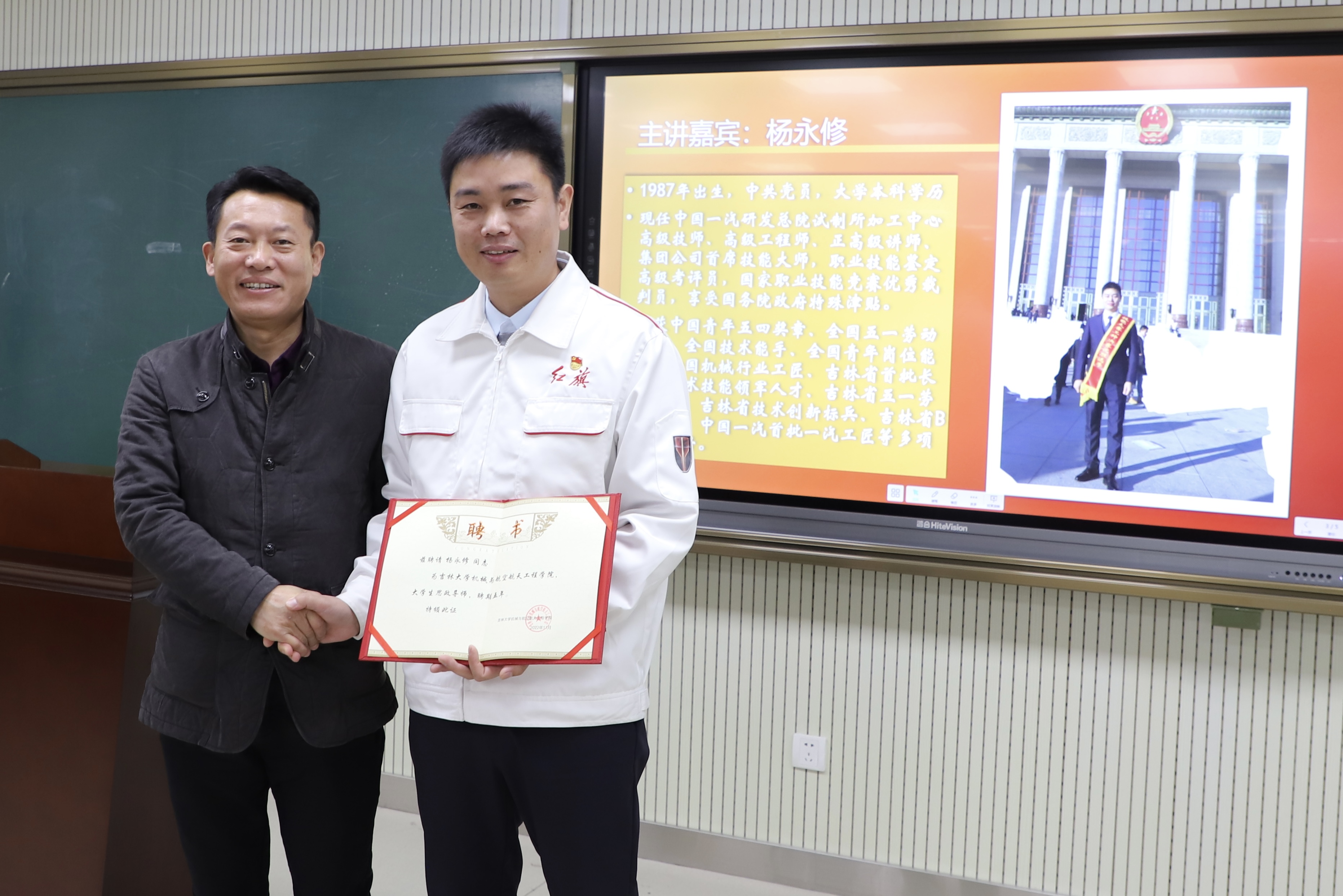 本次讲座以“秉承‘中国制造’心、践行‘工匠精神’魂”为主题,邀请“大国工匠”杨永修作报告。杨永修现任中国一汽研发总院试制所加工中心高级技师、高级工程师、正高级讲师、集团公司首席技能大师,职业技能鉴定高级考评员,国家职业技能竞赛优秀裁判员,享受国务院政府特殊津贴。公司党委书记郑福胜为杨永修颁发了公司“老员工思政导师”聘书,党委副书记黄莹为其颁发“兼职研究生指导教师”聘书。