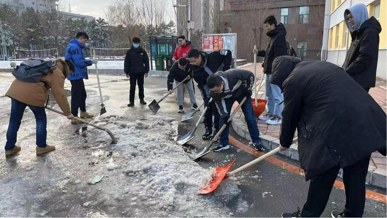 15日下午,研究生党员们冒着寒风,拿起铁锹、扫帚、除冰铲等扫雪工具,在员工干部孟昊楠的组织下迅速组建扫雪先锋队伍。每位同学不畏严寒,齐心协力,一点点地将积雪和冰层铲起集中堆放。经过两个多小时的奋战,公司所负责第一教学楼后侧区域的积雪被清扫的一干二净,扫雪任务圆满完成。