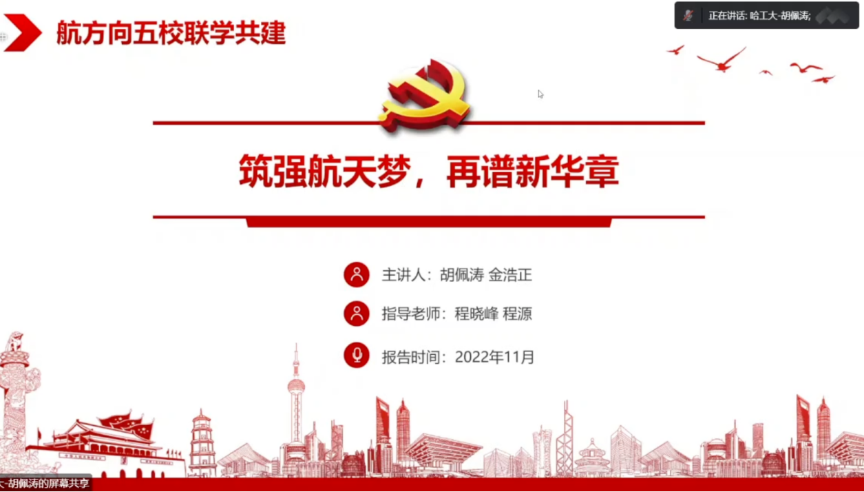 在分享解读二十大精神后,各公司员工党支部以航空航天人才和科研探索为主题进行报告。清华大学航天航空公司郭廷宇以《航天强国梦,矢志报国情》为题,指出中国航天制胜的法宝是:坚持党的集中统一领导,坚持社会主义集中力量办大事的新型举国体制。正是在党的领导下,全国上千家科研院所、大专院校等研制单位协同参与,大力发扬“两弹一星精神”和“载人航天精神”,在关键核心技术领域实现密集突破;北京航空航天大学宇航公司微小卫星实验室刘博涵给大家分享了“北航亚太一号”微小卫星的故事。亚太空间合作组织老员工小卫星项目是国家航天局在“一带一路”国际化空间战略的重点项目。在小卫星的设计过程中,小卫星党支部在疫情来临之时发挥党支部发挥战斗堡垒作用,在卫星研制各阶段党员冲锋在前,承担最繁重的任务,攻坚克难,保证卫星任务的顺利完成。