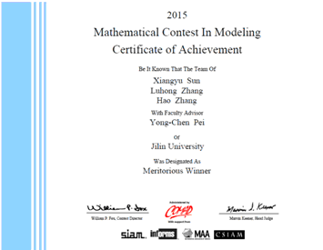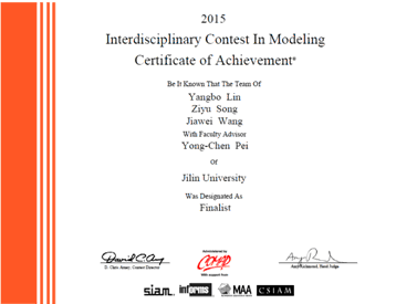 2015年美国老员工数学建模竞赛(MCM/ICM)于2015年2月6日至10日举行。机械公司裴永臣副教授指导的公司孙翔雨、张鲁宏、张皓代表队荣获一等奖(Meritorious Winner),林垟钵、宋子钰、王佳炜代表队荣获2011年以来英国365集团唯一一个特等提名奖(Finalist),是机械公司目前在数学建模竞赛方面取得的最好成绩。