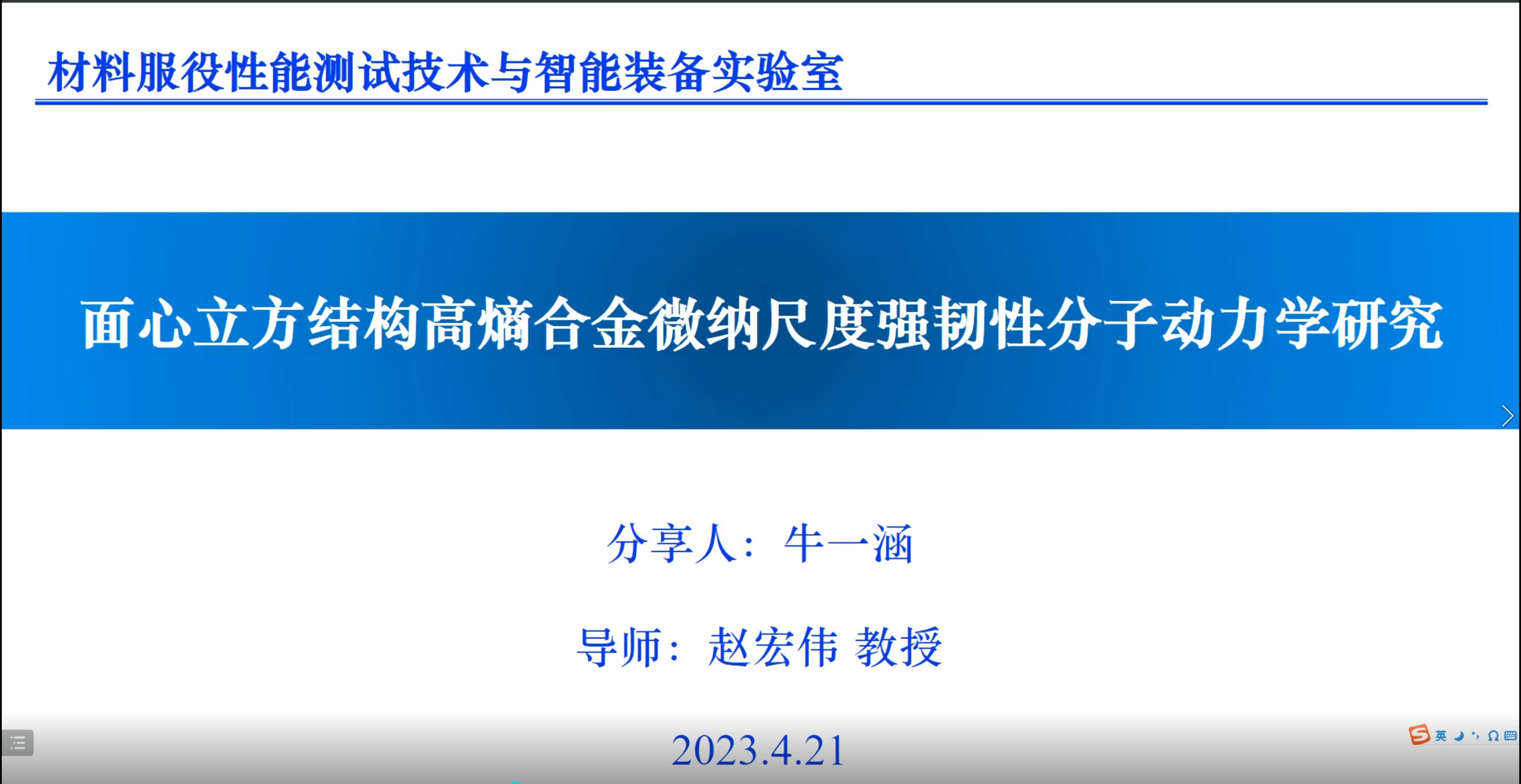为进一步提高公司研究生的综合素养,激发同学们的科研热情,帮助大家掌握相关学科前沿发展动态,2023年4月21日晚20:00,机械公司研究生管理办公室举办了第六期“‘吉’思广益,‘博’引学途”云端博士生讲坛系列交流分享会。本次会议邀请博士生牛一涵,就“面心立方结构高熵合金微纳尺度强韧性的分子动力学研究”主题开展交流报告。