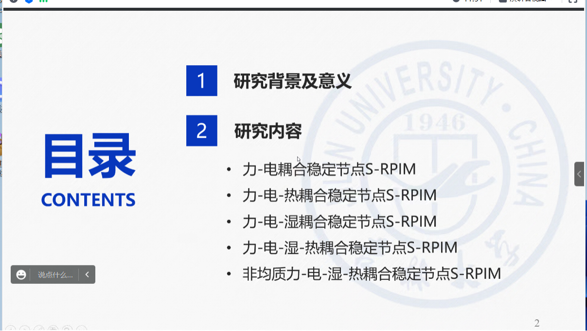 为进一步提高公司研究生的科研素养,激发同学们的科研热情,帮助大家掌握相关学科前沿发展动态,2023年5月16日,公司研究生管理办公室举办了第七期“‘吉’思广益,‘博’引学途”云端博士生讲坛。本次讲坛邀请2020级博士生聂斌,就“压电结构力学响应的多场耦合稳定节点S-RPIM研究”主题开展交流报告。