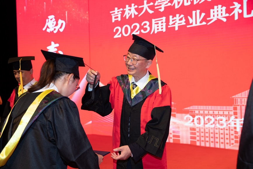 随后,学位授予仪式正式开始。全体2023届毕业生、应邀回母校的2022届毕业生代表依次上台,各位主礼教授为员工拨动流苏并颁发学位证书。
