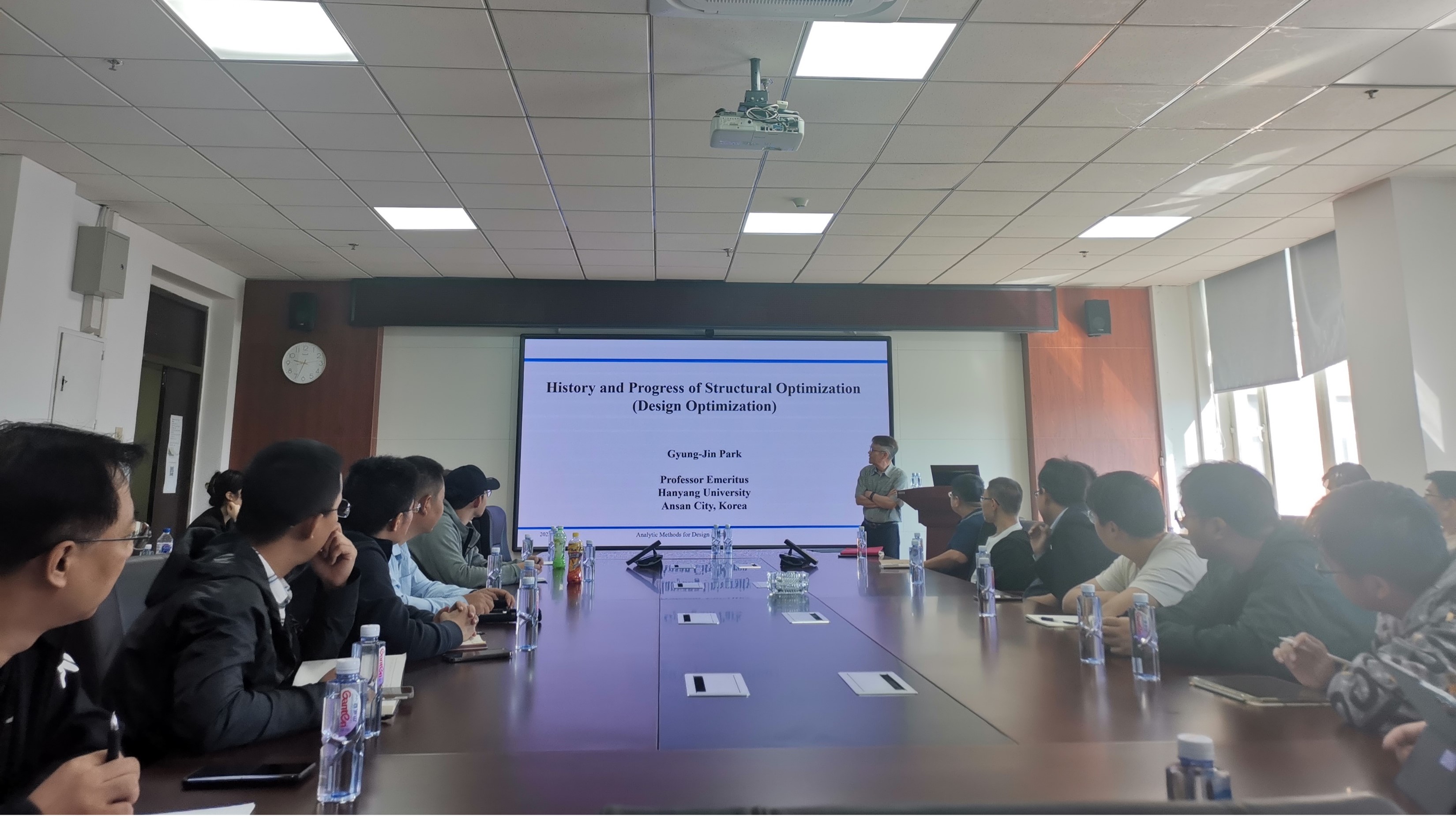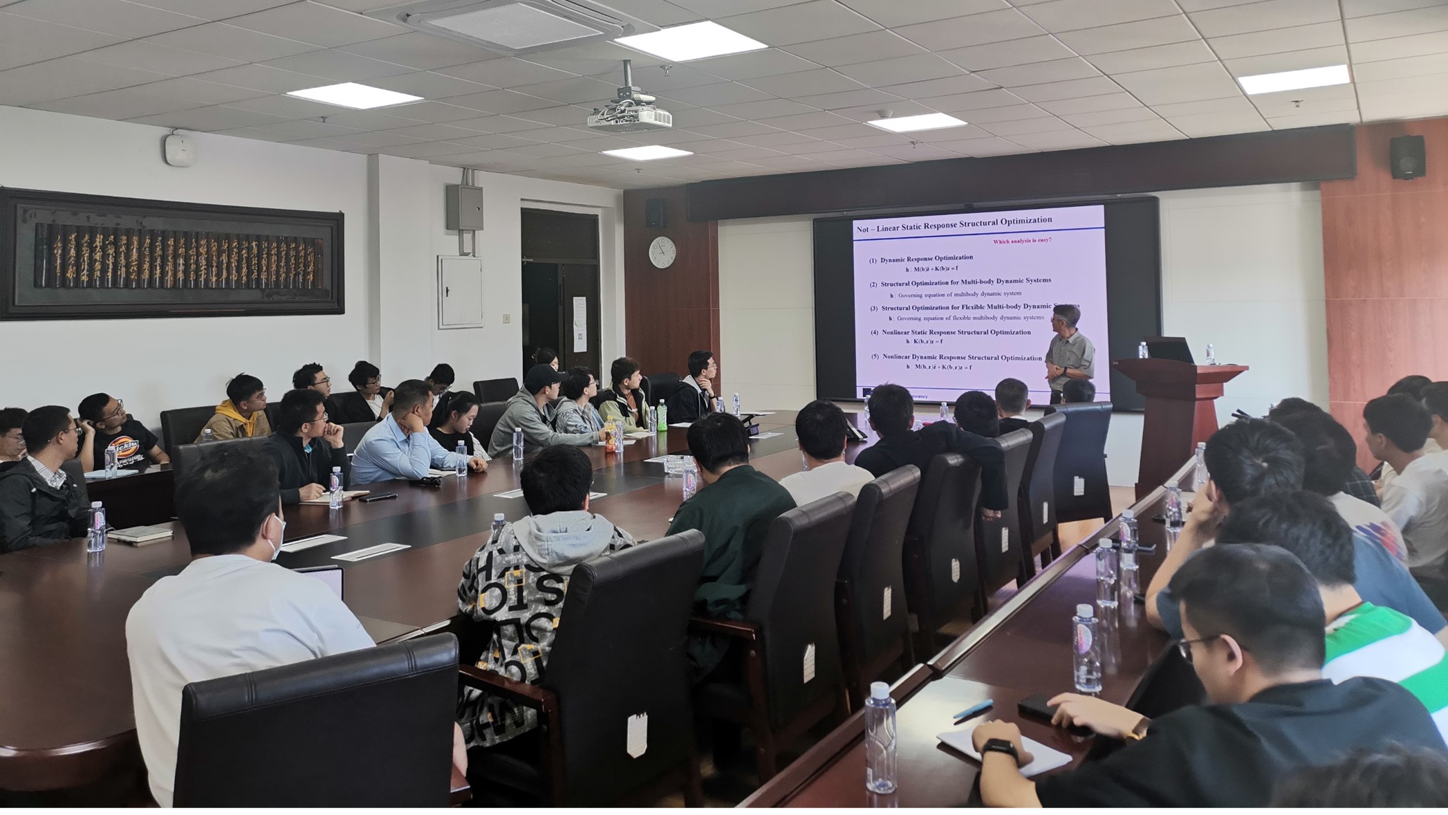 此次讲座围绕优化理论(optimization theory);结构优化(structural optimization);尺寸、形状、拓扑优化的分类(classification of size,shape,and topology optimizations);等效静载荷法(equivalent static loads method)四个板块展开阐述,详细介绍了结构优化相关的知识。在提问环节,教授对师生提出的相关问题进行了详细解答并提出宝贵学术建议。