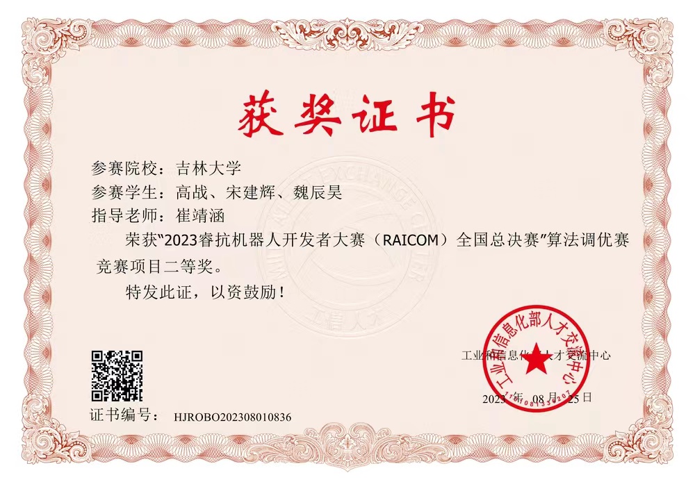 在编程设计赛道(CAIP)编程技能赛项中,高战、宋建辉、魏辰昊(指导教师:崔靖涵)勇夺国家二等奖。