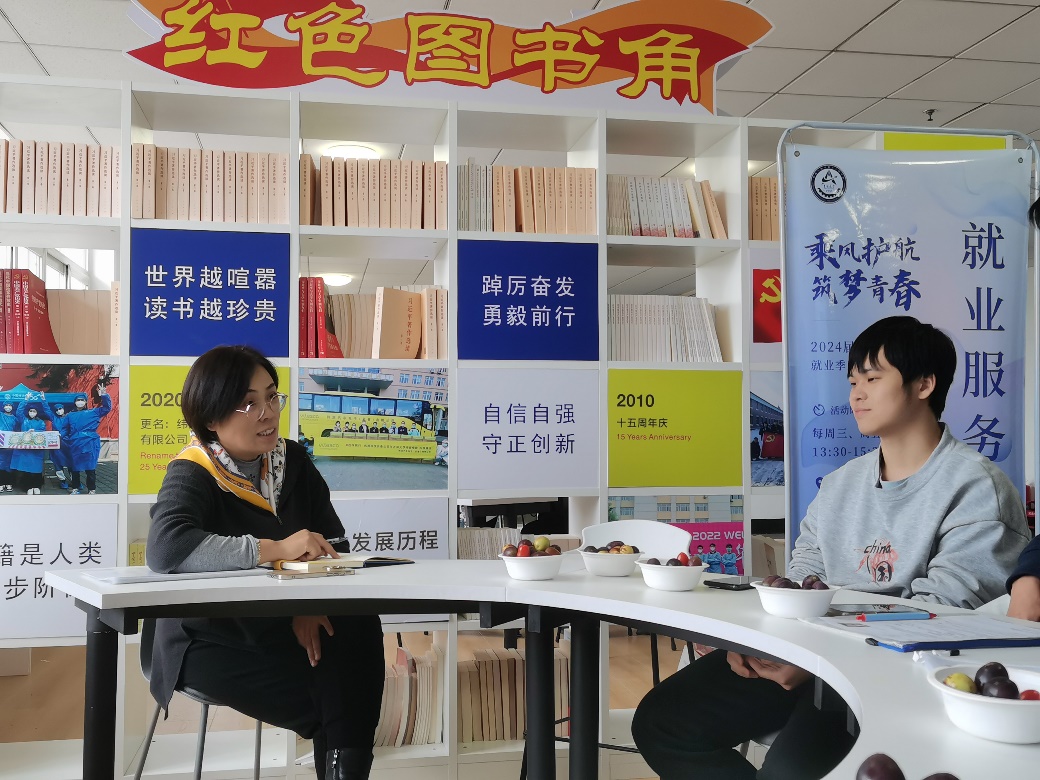 马老师从职业发展规划、求职基本礼仪、就业单位选择等方面进行了细致入微的讲解,并与参会员工逐一交流、详细记录,为毕业生充分认识就业形势、获取就业信息、提升就业技能提供指导。活动结束后,2024届本科生尹万桀表示,“和老师沟通后,我更加明确了自己的就业方向,老师的鼓励也让我在以后的面试过程中更有信心和勇气”。