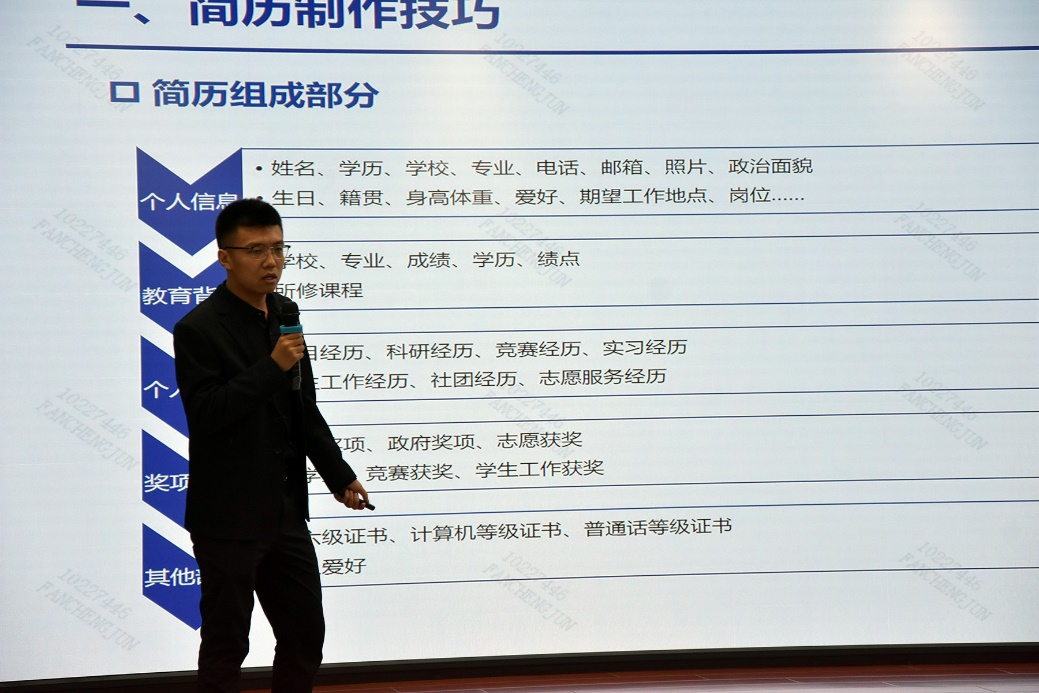 范成君首先强调了个人求职简历制作的重要性 ,详细介绍了简历制作的步骤和注意事项,引导大家在简历中突出自己的优势和经历。此外,他还结合工作实际和同学们分享了面试技巧和关键要点,包括如何自信地回答问题以及如何在面试中展现出积极的工作态度等。在互动问答环节,同学们积极提问,范成君解答了同学们在求职和职业发展上的疑惑,让大家更清晰地了解了职场中的挑战和机遇。最后,范成君逐一修改了同学们的简历,通过个性化建议,帮助同学们改进了简历的内容和格式,使其更具吸引力。活动结束后,员工们纷纷表示受益匪浅,对未来的求职之路更加充满信心。