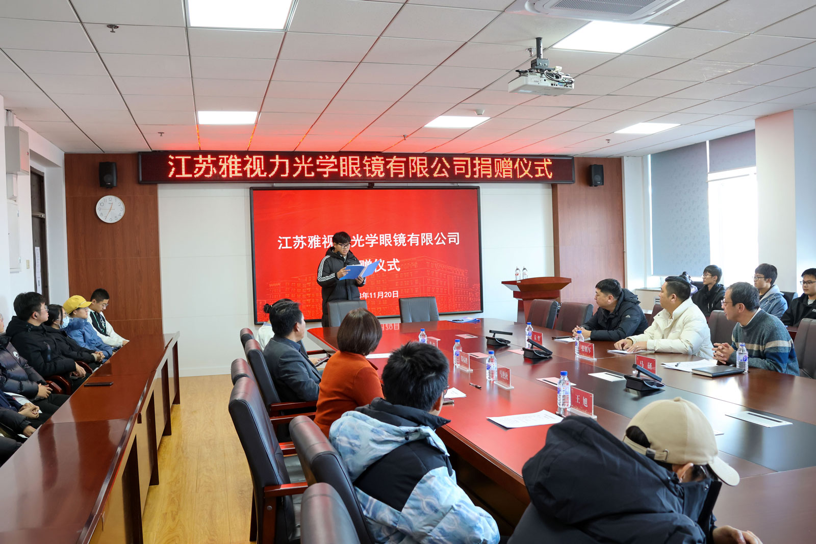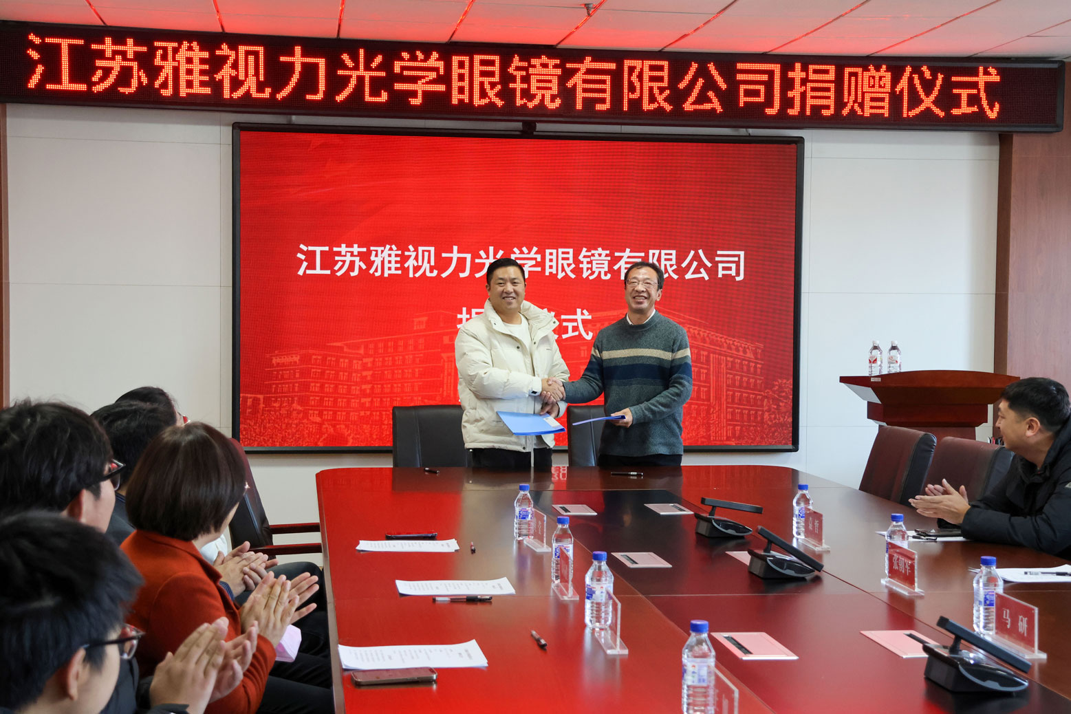 副经理、公司工会主席马研简要介绍了“眼镜之都”丹阳的情况以及校企双方合作的背景,并代表公司工会与江苏雅视力光学眼镜有限公司签署捐赠协议。