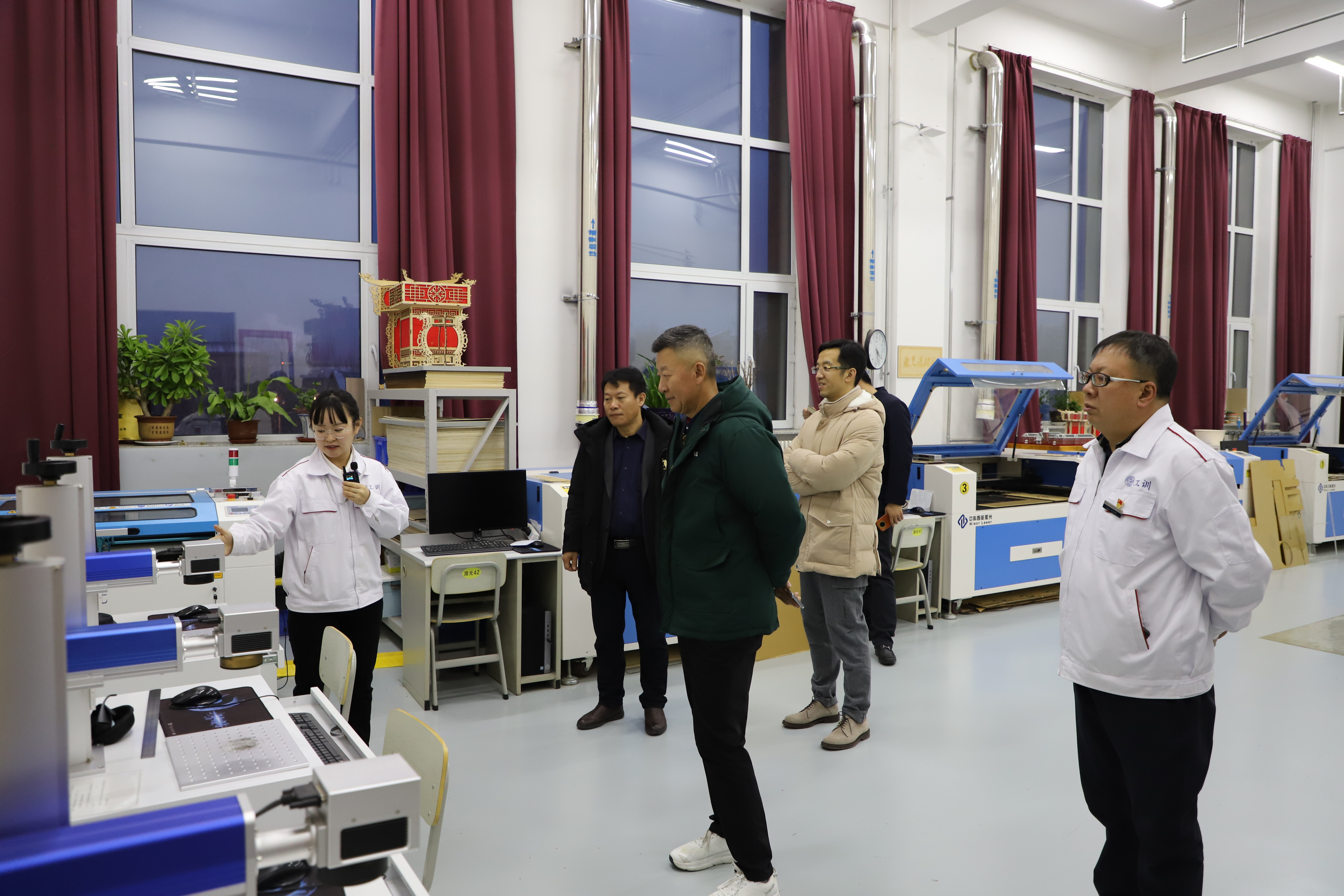 随后马佳一行走进工程训练中心,从加工中心、智能制造、激光加工到数控车、竞技机器人、多线联动等实训教学场所,对工程训练中心的实验室建设和实践教学给予了高度称赞,同时在现场也感慨着工程训练中心的巨大变化,追忆起曾经挫金工锤子的年少时光。