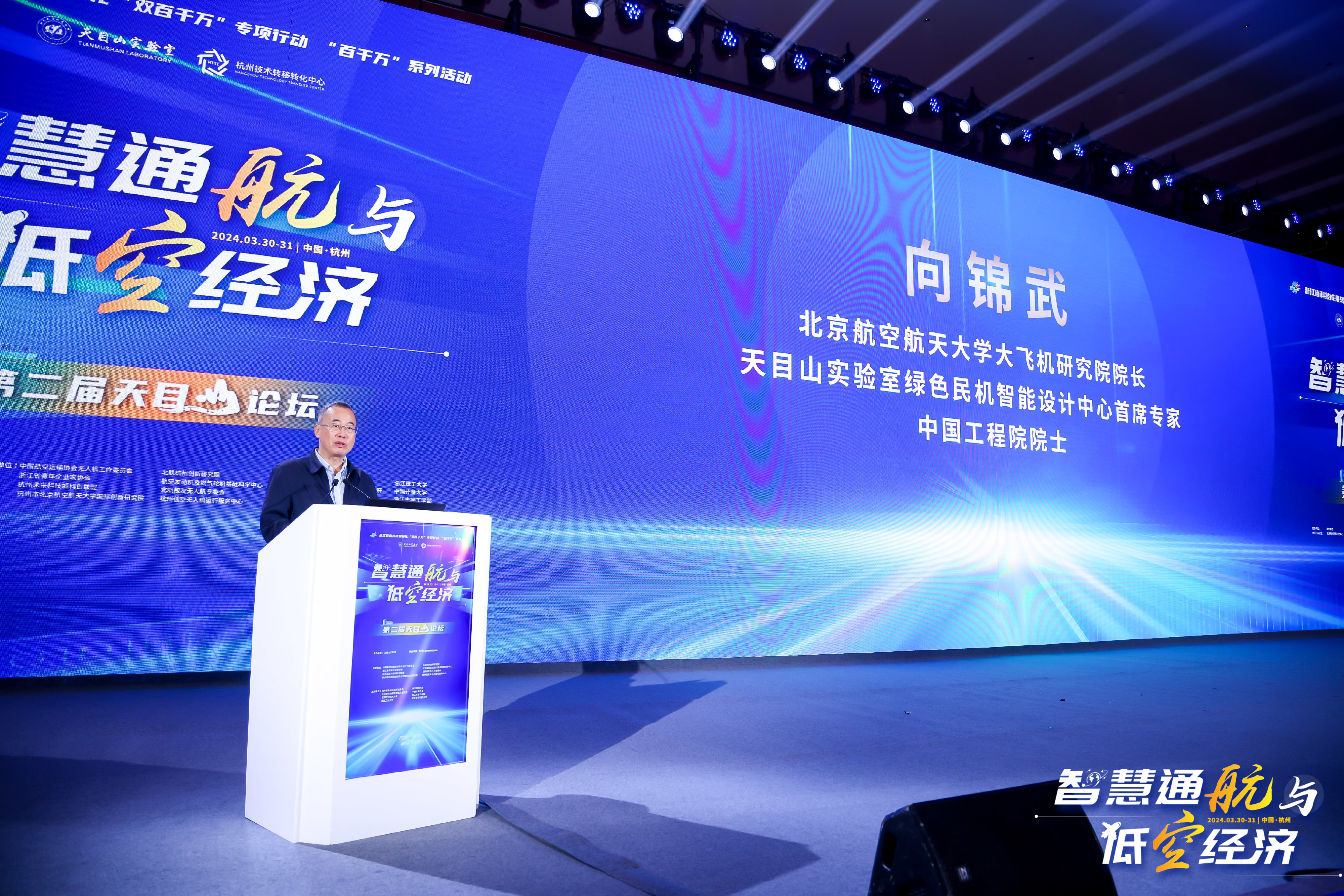 会议首先由大会执行主席、北京航空航天大学大飞机研究院经理、天目山实验室绿色民机智能设计中心首席专家、中国工程院院士向锦武致辞。他表示低空经济是战略性新兴产业,智慧通航是推动低空经济持续健康发展的核心动力。作为新质生产力代表,低空经济被喻为下一个“新能源汽车产业”,今年被称为低空经济商业化元年。希望通过本次大会,达成低空经济领域技术发展与产业发展的共识,凝心聚力,共同推动浙江省低空经济发展。