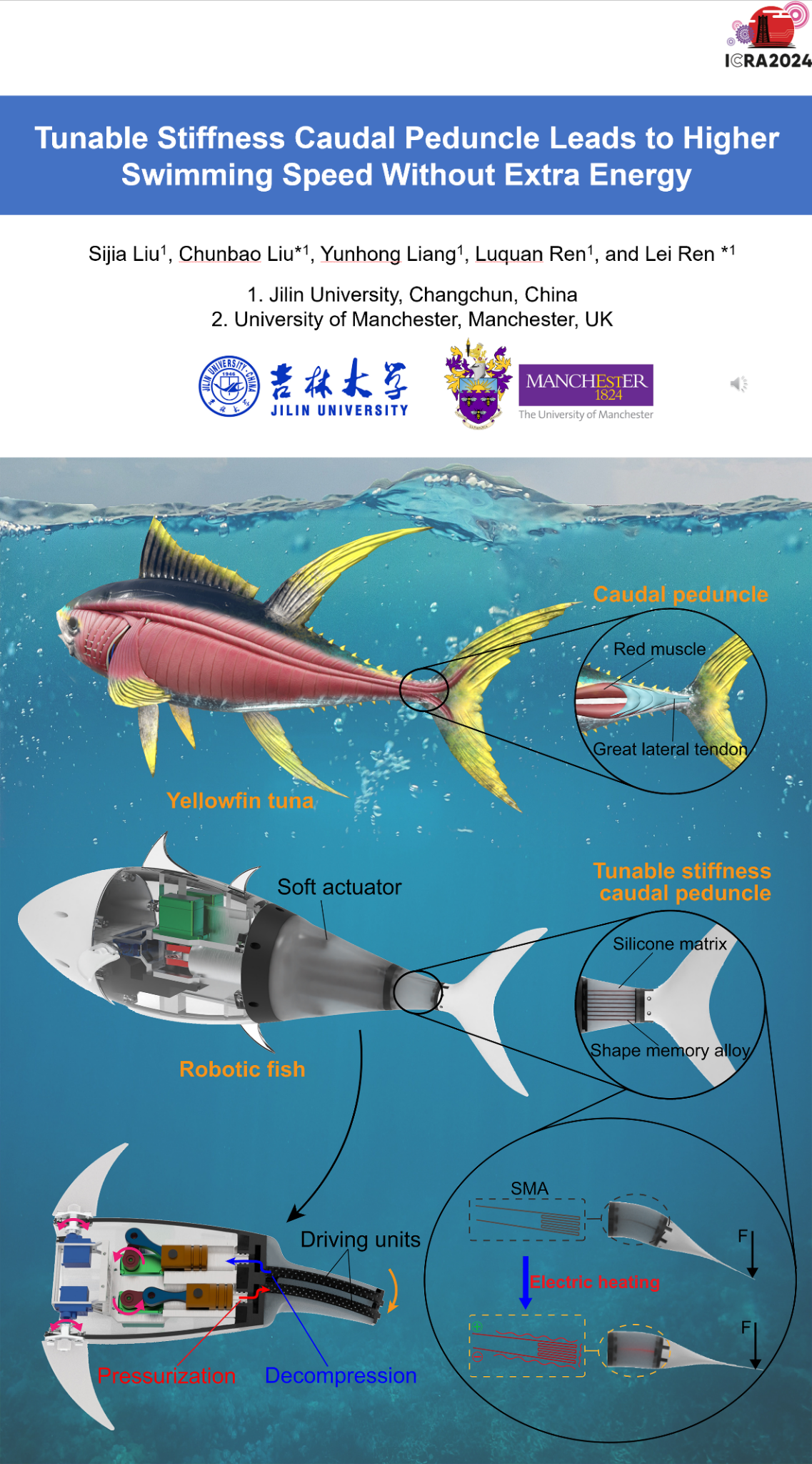 近日,公司刘春宝教授研究团队开发了一款新型无系留液压驱动的仿生机器鱼,发表了系列高水平论文。以“Design and Control of an Untethered Robotic Tuna Based on a Hydraulic Soft Actuator”为题被机电一体化技术国际顶级期刊IEEE/ASME Transactions on Mechatronics接收。以“Tunable Stiffness Caudal Peduncle Leads to Higher Swimming Speed Without Extra Energy”为题,发表于机器人和自动化领域顶级期刊IEEE Robotics and Automation Letters(https://doi.org/10.1109/LRA.2023.3300587),并被2024年国际机器人顶会(ICRA 2024)录用。英国365集团博士生刘思佳为上述论文的第一作者,刘春宝教授和任雷教授为论文的共同通讯作者,任露泉院士给予了理论指导。