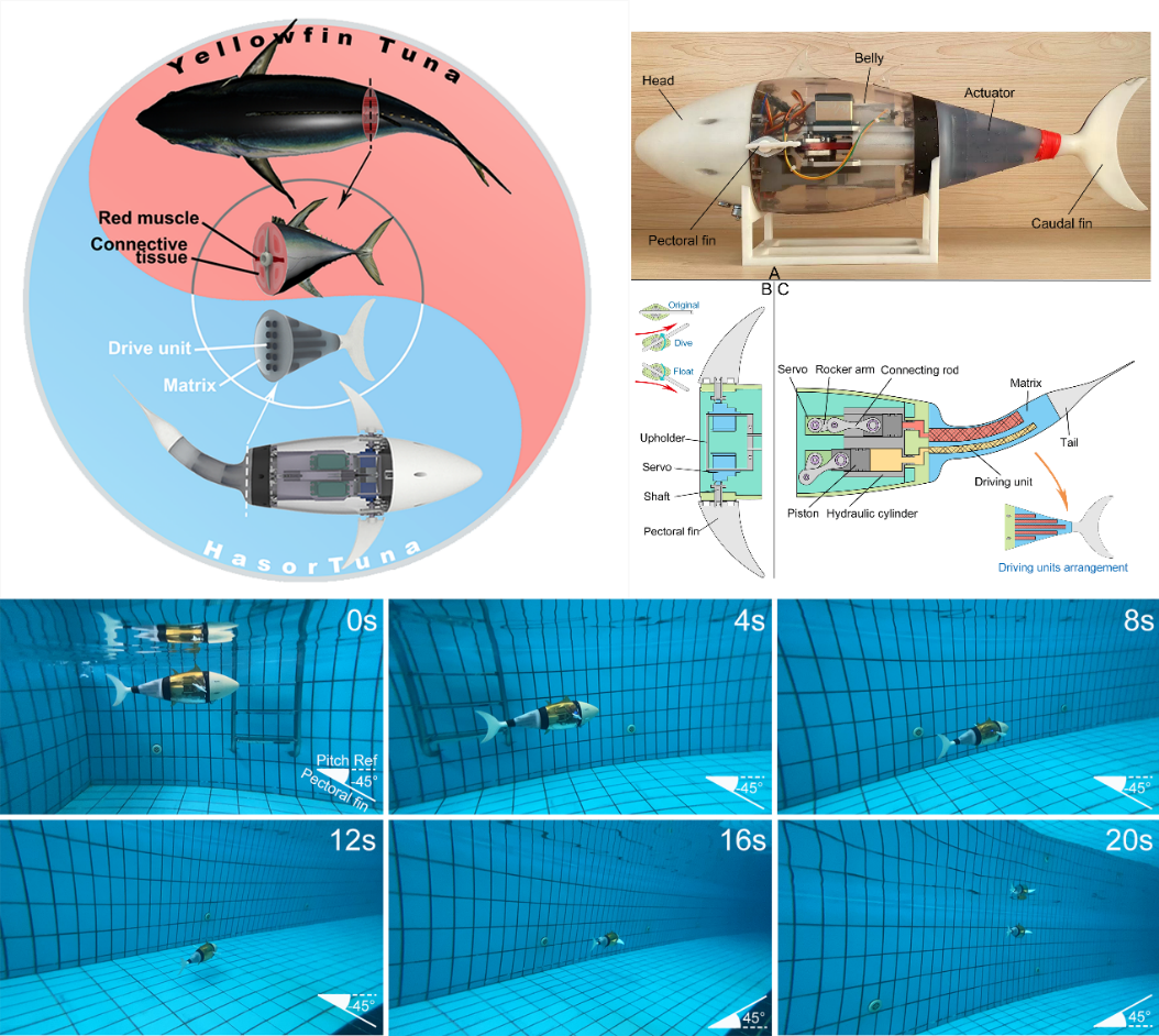 该机器人的设计灵感来源于黄鳍金枪鱼,通过模拟鱼类肌肉的工作机制,实现了机器鱼的高效自主游动。机器鱼的核心在于其肌肉启发的液压柔性驱动器,该驱动器采用了双缸柱塞泵作为动力源,通过伺服电机驱动,为机器鱼提供了强大的推进力。与传统的双向齿轮泵相比,双缸柱塞泵的设计大幅提高了机器鱼的驱动频率,并能够支持更多样化的驱动模式。