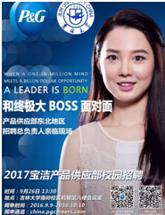 招聘要求:1. 具备本科或以上学历,对供应链工作充满热情;2.申请宝洁产品供应部没有专业限制;3. 欢迎2017年应届毕业生申请全职岗位,2018年应届毕业生申请暑期实习生岗位。