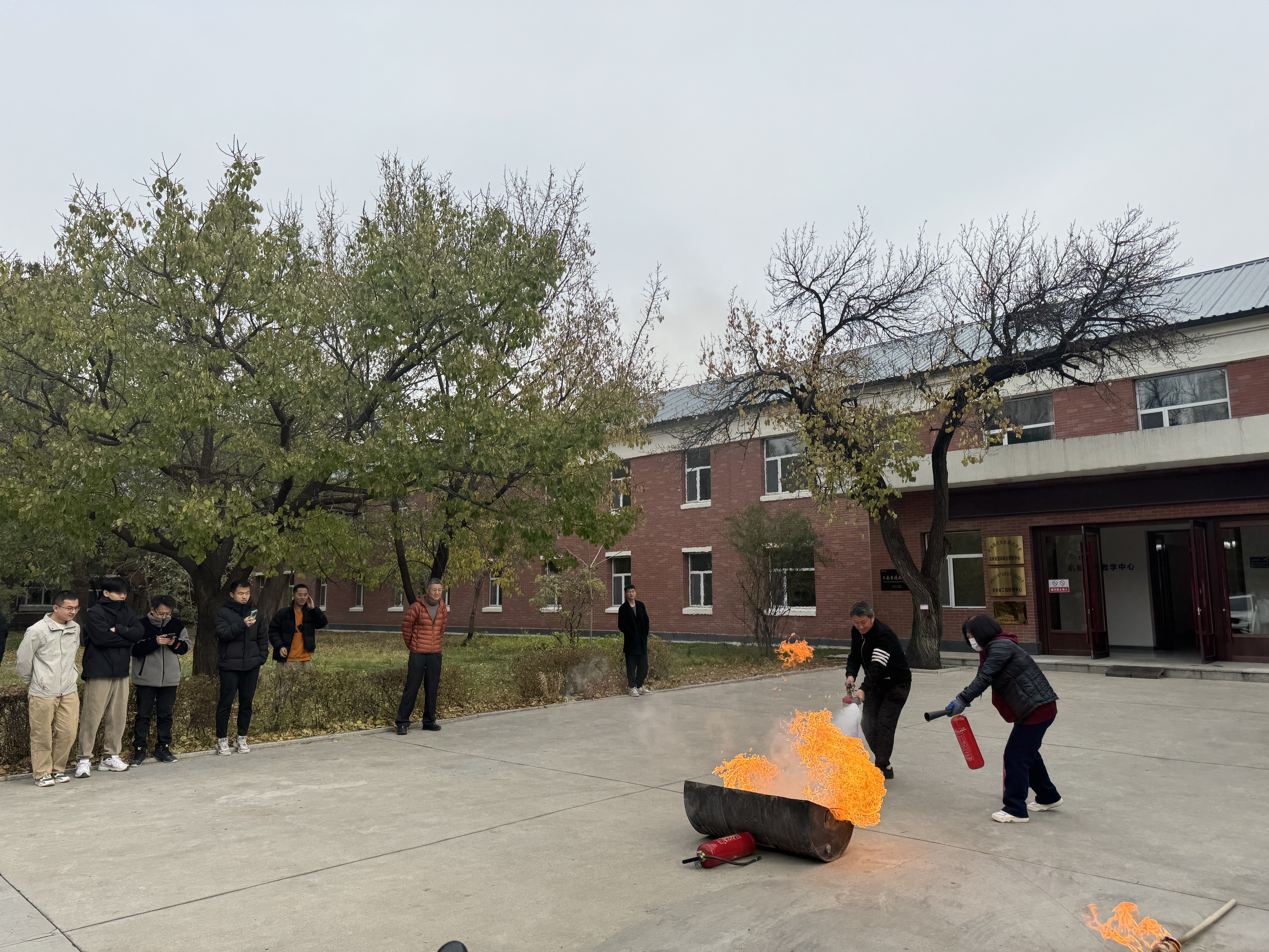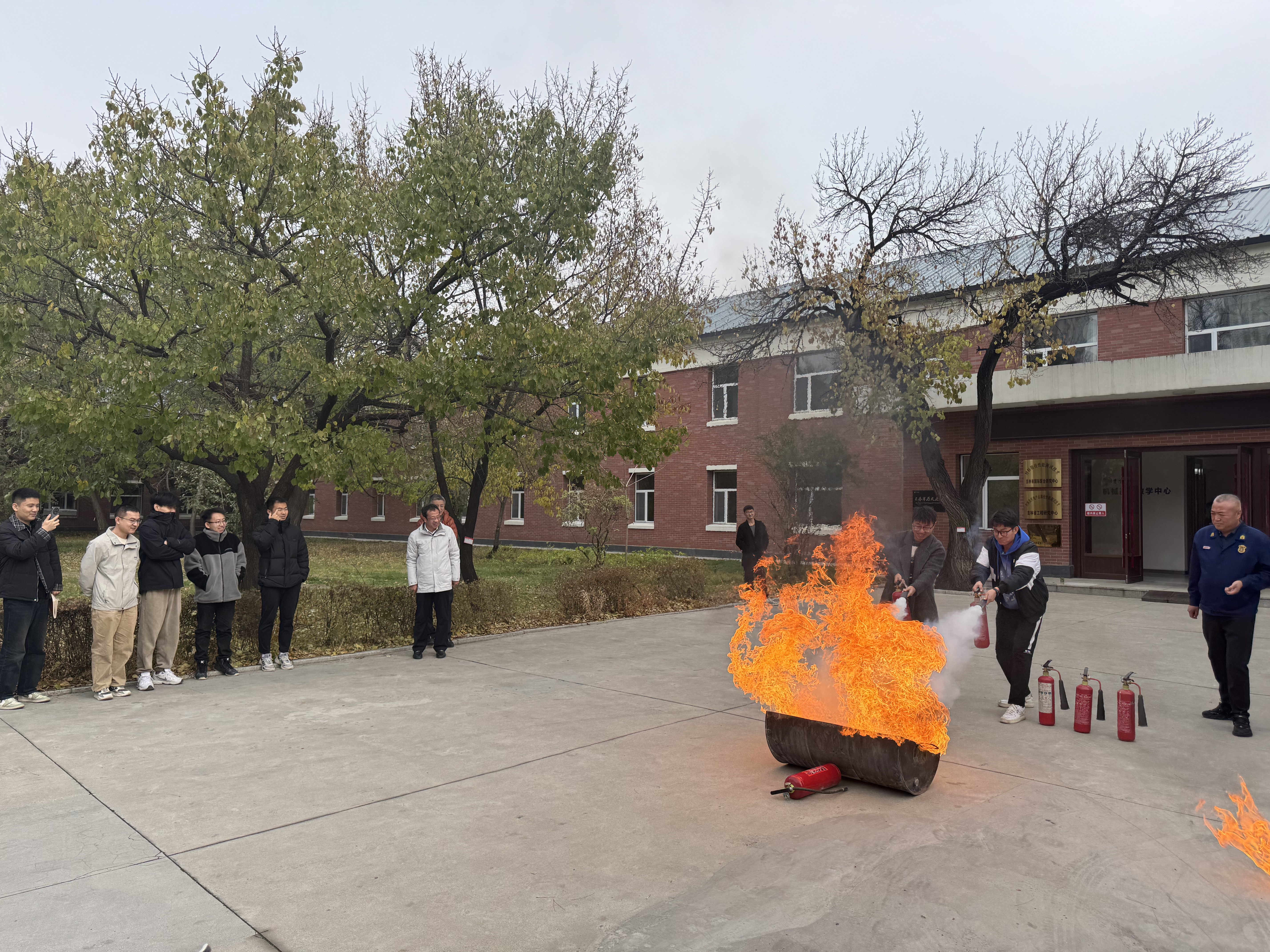 消防疏散演练在东区保卫办刘海江老师的指导下有序进行。在室外,王中刚讲解了二氧化碳灭火器的使用方法,并进行了现场演示。现场师生代表兴趣盎然地参与了灭火实操。演练过程中,王中刚还针对同学们距离火源过近、未指向火焰根部等问题进行了指导。