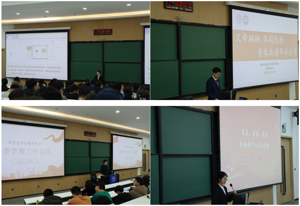 会上,团委组织部、办公室等13个部门的负责同学结合全年工作重点,分别围绕部门职能、工作概述、活动成效、未来展望等方面进行了工作述职。各部门负责人回顾了本学期的工作成效,分析了工作不足,明确了今后工作方向和改进措施,表示将推进员工工作提质增效,更好地服务同学。会议尾声,团委负责人齐芮老师对各部门工作给予总结评价,鼓励大家踏实奋进。她感慨道,这学期一路走来,深切感受到了大家的蜕变,每一步都印刻着努力与奋斗的痕迹。