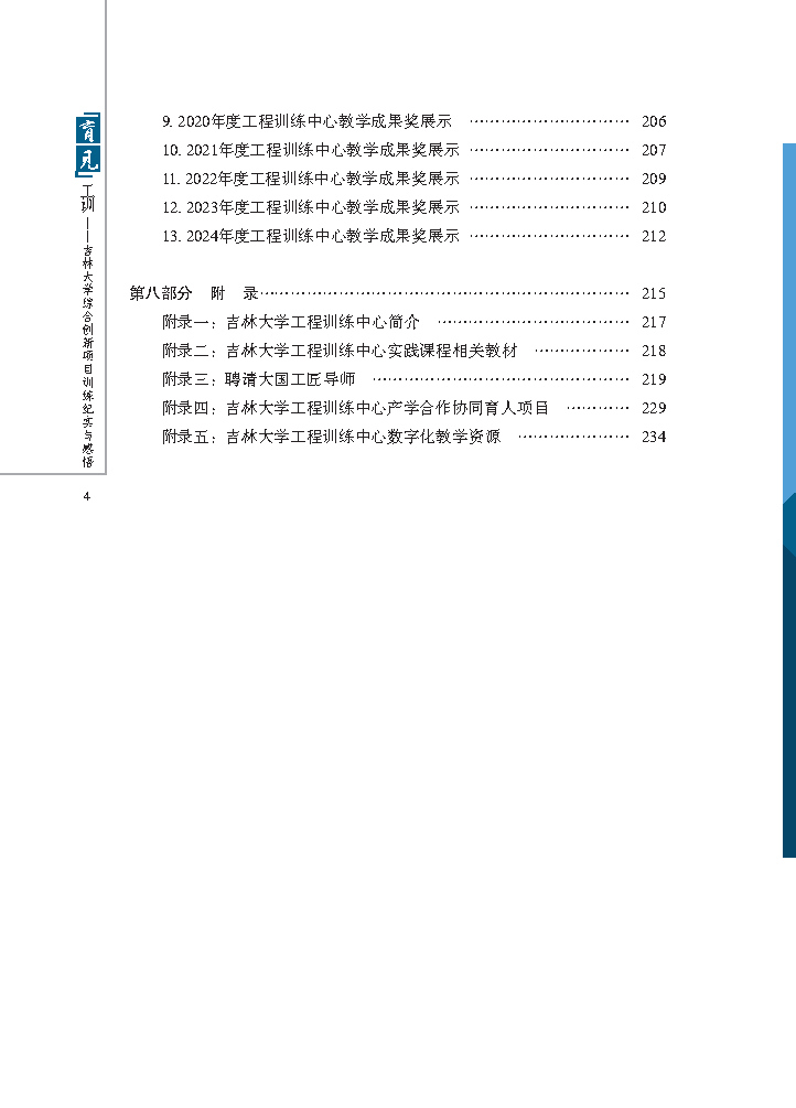书中特别设置“员工心得体会”和“指导教师心得体会”栏目,以第一视角还原了师生在项目中的心路历程。例如,参与“基于激光切割与铸造工艺的中式古典建筑制造”项目的同学说“工程训练项目不仅让我们掌握了新的技术和知识,更重要的是让我们学会了如何将所学应用到实践中去,如何将现代技术与传统文化相结合。我们相信,在未来的学习和工作中,这些经验和技能将会为我们带来更多的机会和收获。参与“NAO机器人舞蹈——人类命运共同体”项目的同学说“这次机器人舞蹈项目不仅是一门课程,更是一次成长的旅程。在整个项目完成的过程中,我们把在课堂上学习到的理论知识逐渐在实践中运用了起来,这让我们对以前所学的知识也有了更深刻的理解。它让我们在知识、技能、心态等多方面都得到了锻炼和提升,也让我们在机器人领域有了更深入的探索,对自己的未来发展与规划有了更深入的思考。”