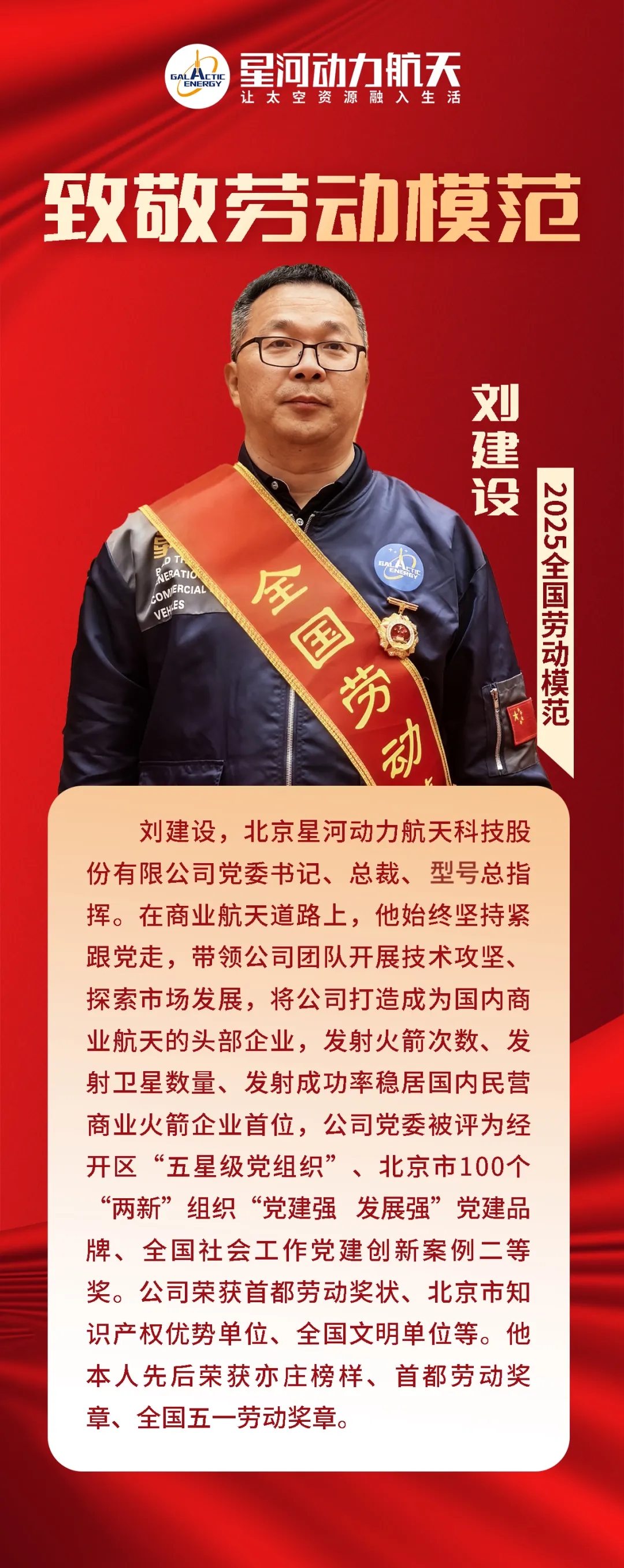 2025年4月28日上午,庆祝中华全国总工会成立100周年暨全国劳动模范和先进工作者表彰大会在人民大会堂隆重举行。优秀员工,北京星河动力航天科技股份有限公司党委书记、总裁、型号总指挥刘建设被中共中央、国务院授予“全国劳动模范”荣誉称号。