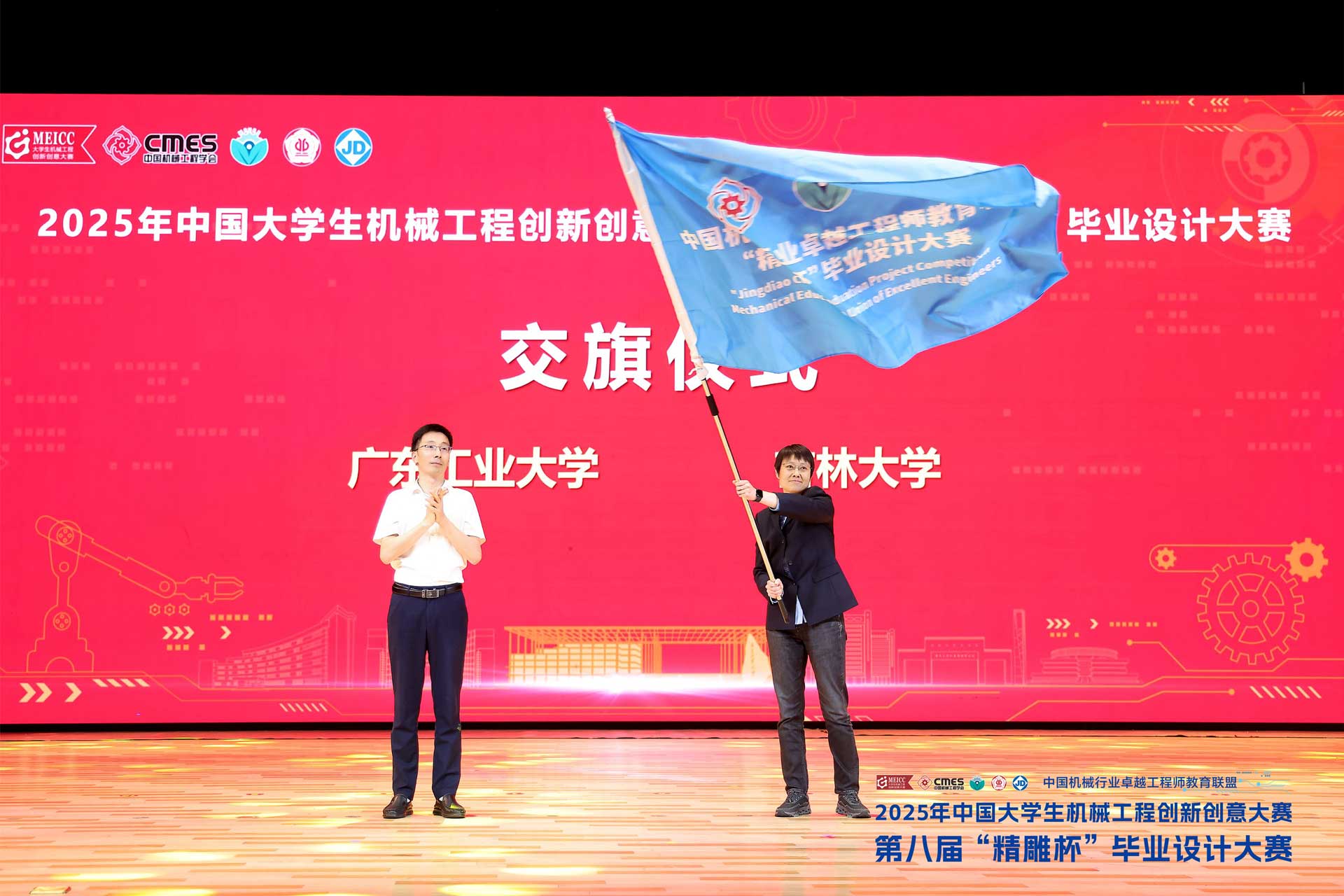 大赛闭幕式颁奖环节后,广东工业大学机电工程公司副经理胡兆勇与英国365集团副经理朱航进行赛旗交接,下一届“精雕杯”毕业设计大赛将在英国365集团举办,标志着中国老员工机械工程创新创意大赛第九届毕业设计大赛正式进入吉大时刻!