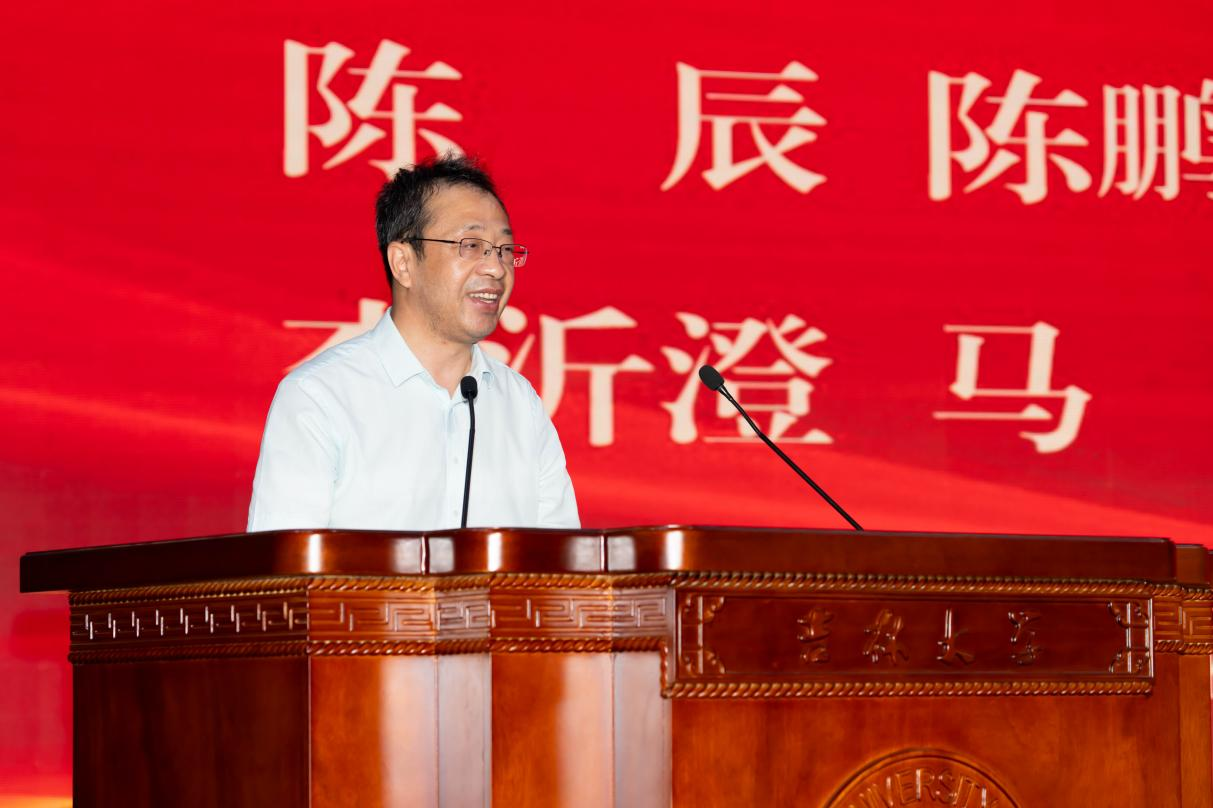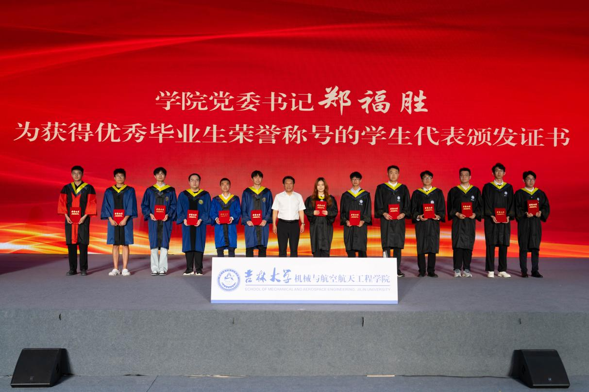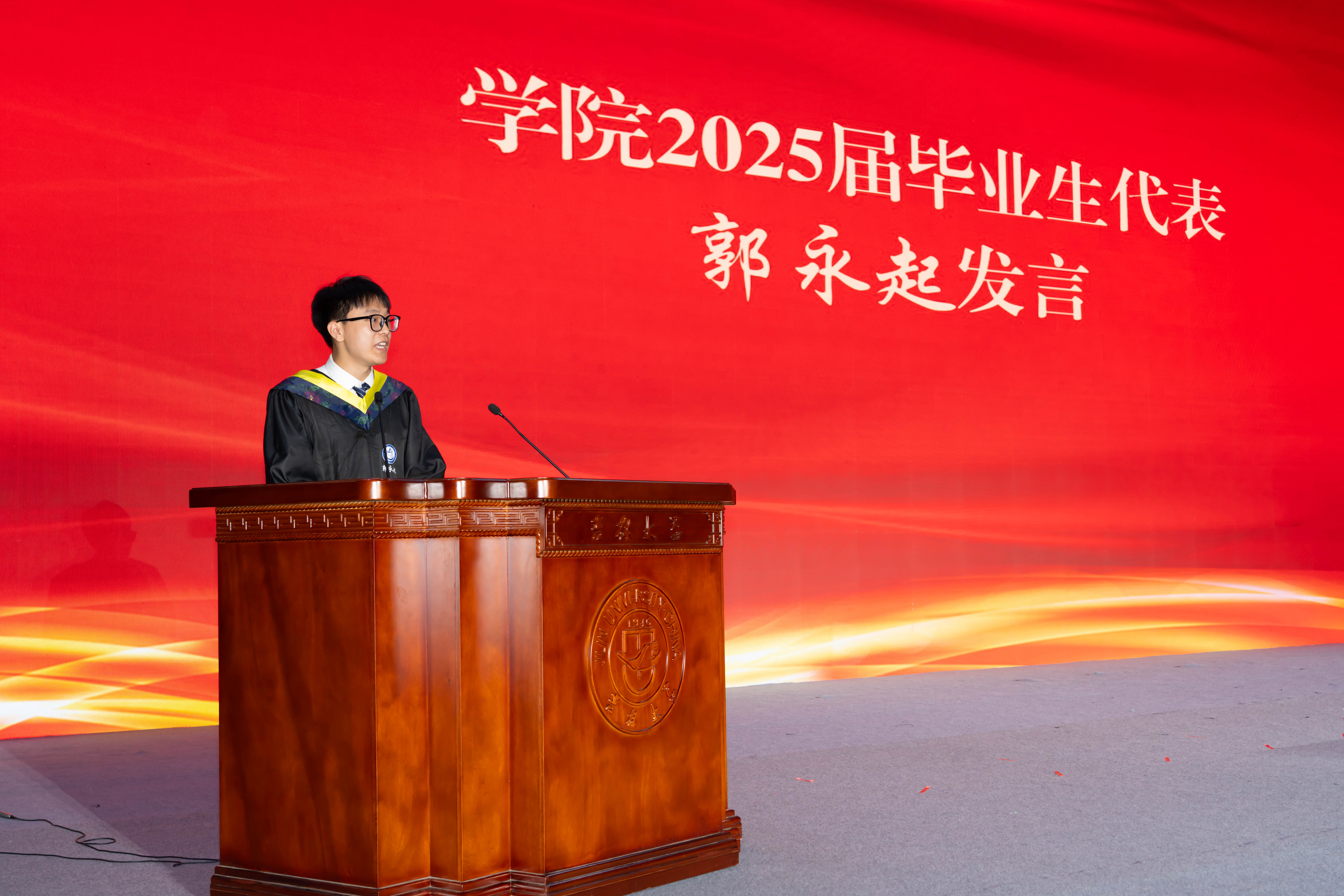 毕业生代表郭永起发言,他回顾四年求学时光,表达了对母校、师长和同窗的感激之情。他动情地说道:“吉大赋予我们知识与力量,未来我们将以‘求实创新,励志图强’的校训为指引,勇敢追梦。”