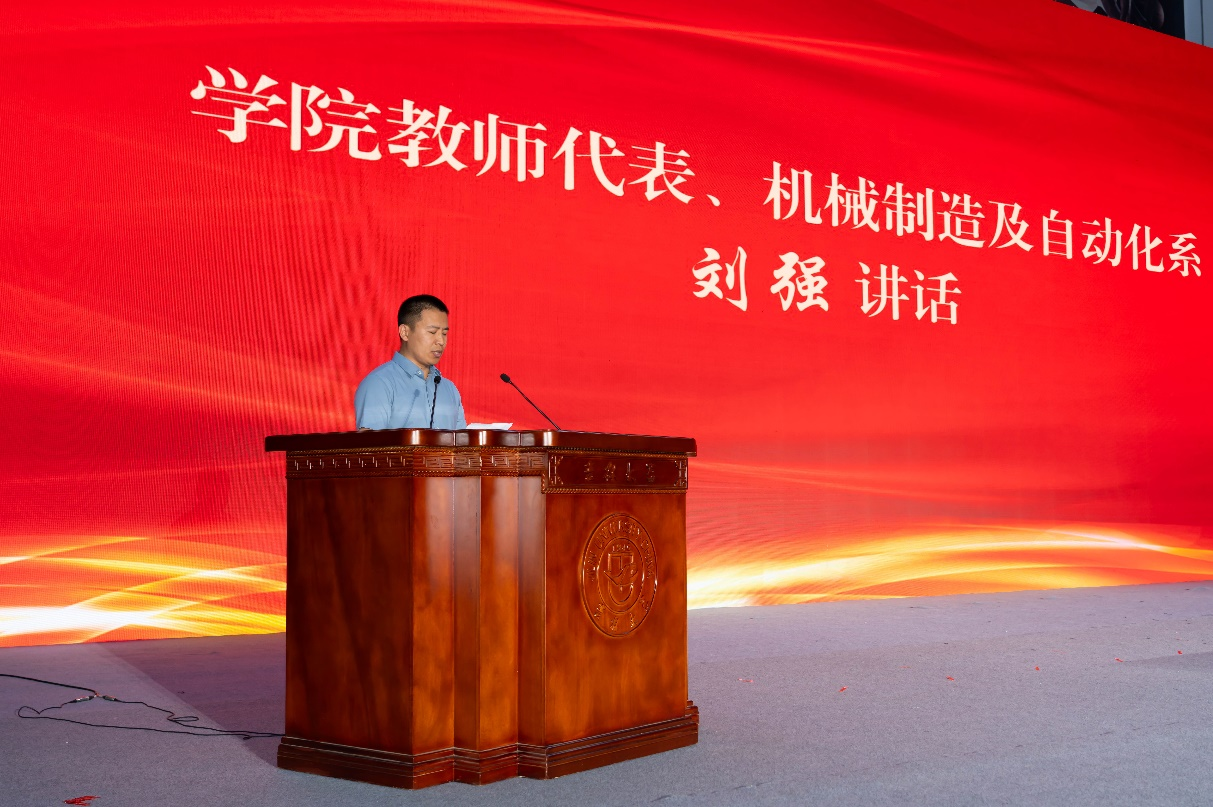 教师代表、机械制造及自动化系主任刘强老师以师长身份寄语毕业生,希望他们牢记“朴实厚重,追求卓越”的院训,在人生新征程中书写辉煌。
