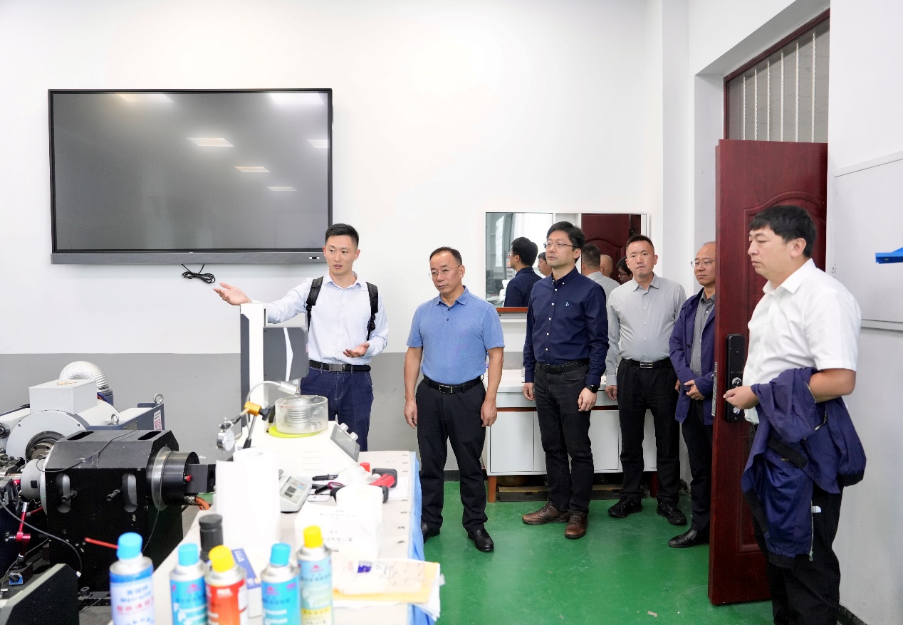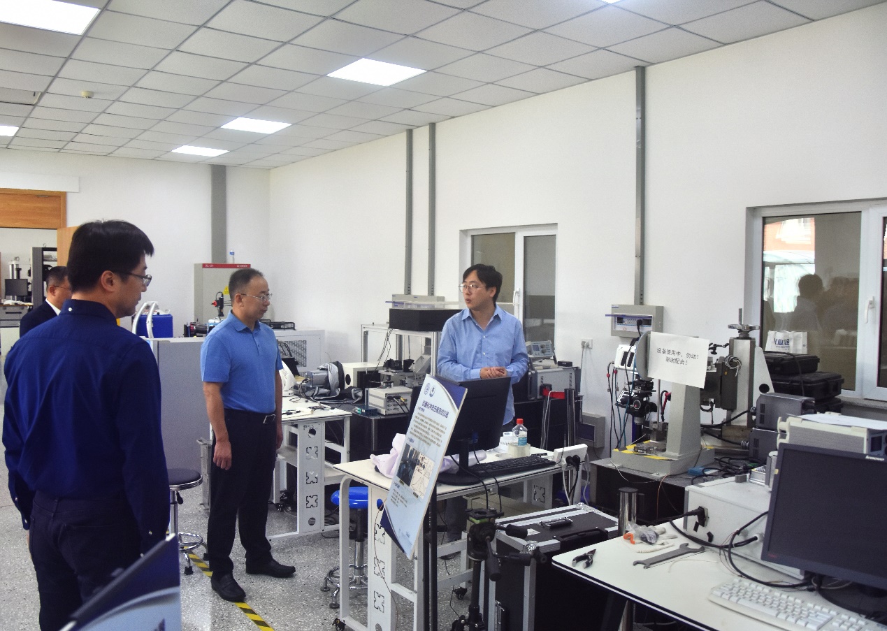 在参观环节,王成明一行参观了数控装备可靠性教育部重点实验室,齐宝宝、王顺博老师对实验室的发展现状和自主研制的仪器设备等进行了详细讲解。