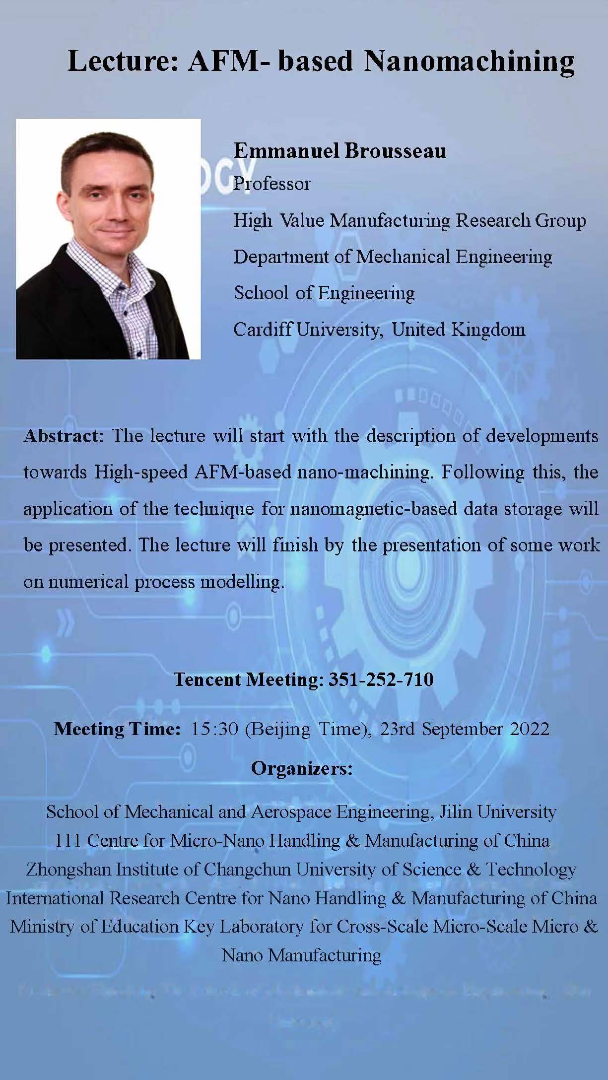 Emmanuel Brousseau是卡迪夫大学工程公司教授,机械和医学工程系的教学主任,目前的研究领域包括先进制造技术、纳米机械加工和激光加工。Emmanuel Brousseau教授在微纳米制造领域发表了100多篇同行评议的论文(包括60多篇期刊论文),项目总经费达120万英镑。2012年,获得英国研究理事会为期五年的学术奖学金。