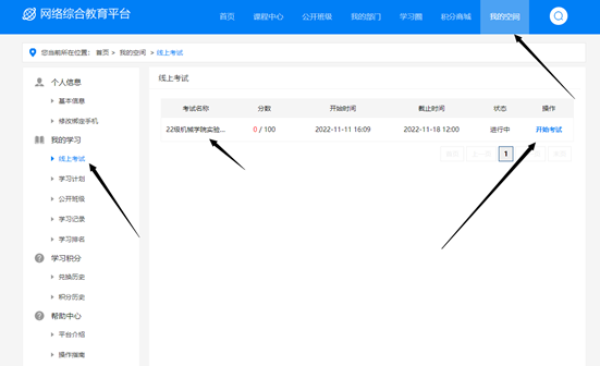 登录进网站后点击“个人中心”进入“我的空间”,查找“我的学习->线上考试”,考试名称为:“22级机械公司实验室安全考试”,点击开始考试进行安全教育考试