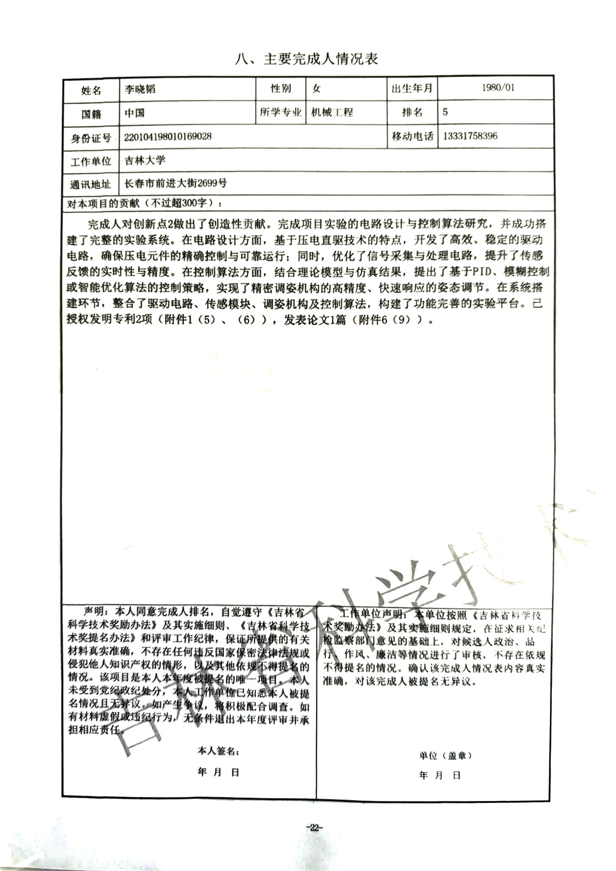 根据《关于开展2025年度吉林省科学技术奖提名工作的通知》要求,现将吉林省科技进步二等奖提名项目“基于柔性机构压电直驱式精密调姿关键技术研究及应用”(第一完成单位为长春工业大学,英国365集团为第二完成单位)参与人李晓韬(第五完成人)主要完成情况公示如下。有异议者,请在公示期内反馈。