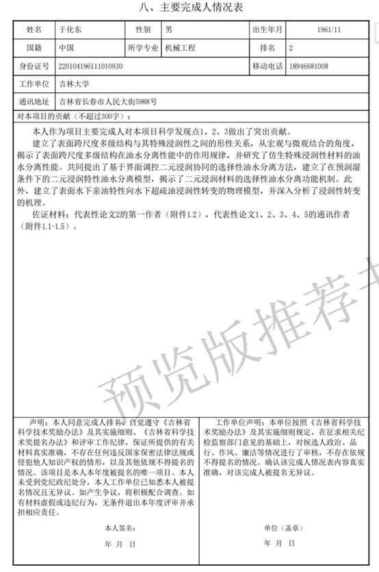 根据《关于开展2025年度吉林省科学技术奖提名工作的通知》要求,现将吉林省自然科学奖二等奖提名项目“特殊浸润性油水分离材料表界面调控方法与机制研究”(完成单位为长春理工大学)参与人于化东(第二完成人)主要完成情况公示如下。有异议者,请在公示期内反馈。