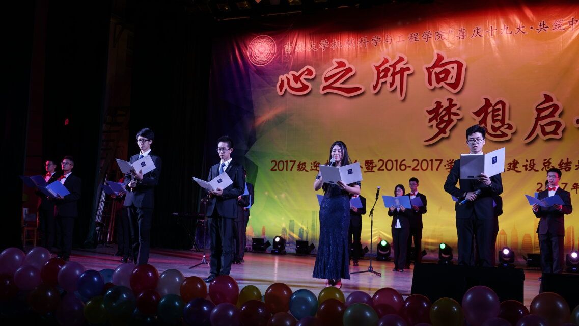 党的十九大描绘了新时代的宏伟蓝图,指明了前进方向,使广大师生深受鼓舞、倍感振奋。为了深入宣传十九大精神,让同学们牢记最初的梦想,充分展现学子风采,机械科学与工程公司“喜庆十九大,共筑中国梦”系列活动之2017级迎新晚会暨2016-2017学年学风建设总结表彰大会于11月30日晚6点在文化活动中心举办。南岭校区教务办公室主任周伟,机械科学与工程公司党委书记程钺、党委副书记王柏、党委副书记兼副经理郑福胜,副经理周晓勤、姚国凤、王继新、曲兴田,机械基础教学中心副主任寇尊权、员工工作办公室主任李佳亮、辅导员辛闯等参加此次活动。