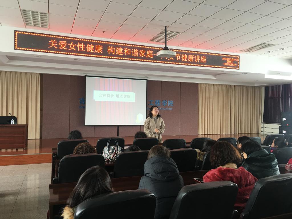 为纪念第108个国际妇女节,帮助广大女性师生更好地关注自身和家人健康,进一步构建和谐美丽家庭。3月7日,机械科学与工程公司和材料科学与工程公司在机械材料馆联合举办了“关爱女性健康,构建和谐家庭”—妇女节健康讲座。由公共卫生公司营养教研室郭瑛教授主讲,机械公司和材料公司女性教职工和同学认真听取了讲座。